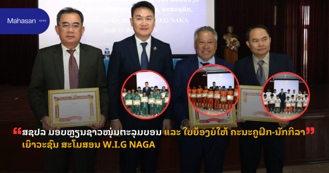 ສຊປລ ມອບຫຼຽນຊາວໜຸ່ມຕະລຸມບອນ ແລະ ໃບຍ້ອງຍໍໃຫ້ ຄະນະຄູຝຶກ-ນັກກິລາເຍົາວະຊົນ ສະໂມສອນ W.I.G NAGA