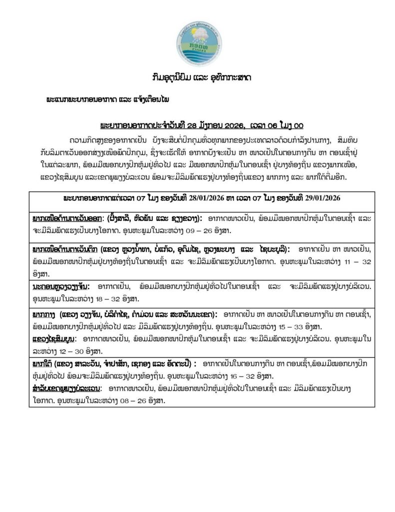 ນະຄອນຫລວງວຽງຈັນ: ອາກາດເຢັນ, ພ້ອມມີໝອກບາງປົກຫຸ້ມຢູ່ທົ່ວໄປໃນຕອນເຊົ້າ ແລະ ຈະມີລົມພັດແຮງຢູ່ບາງບໍລິເວນ ອຸນຫະພູມໃນລະຫວ່າງ 18–32 ອົງສາ.