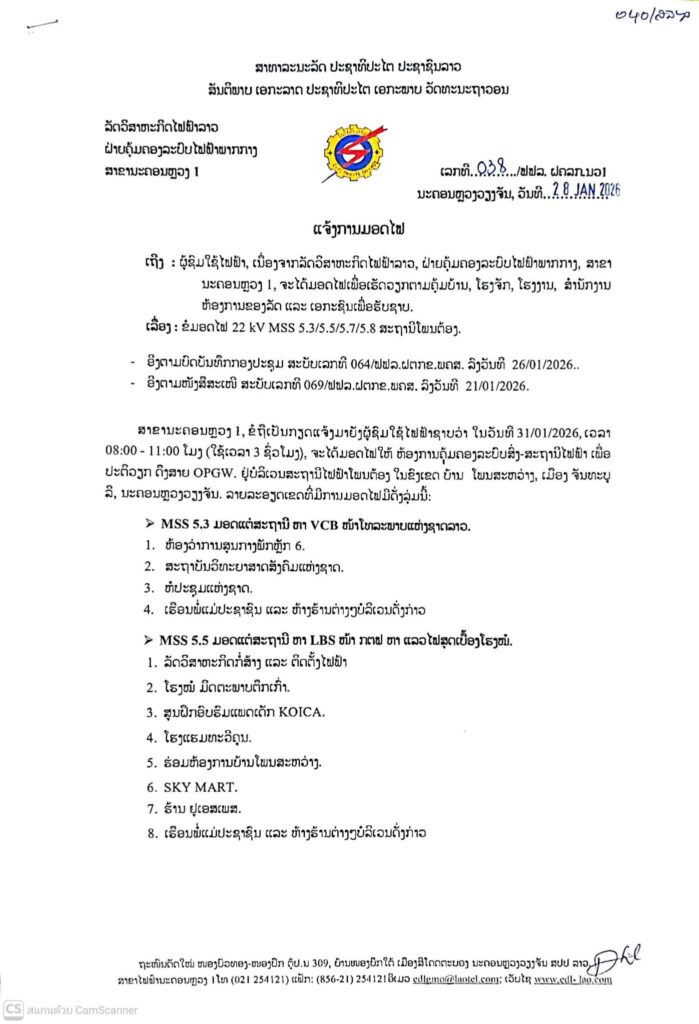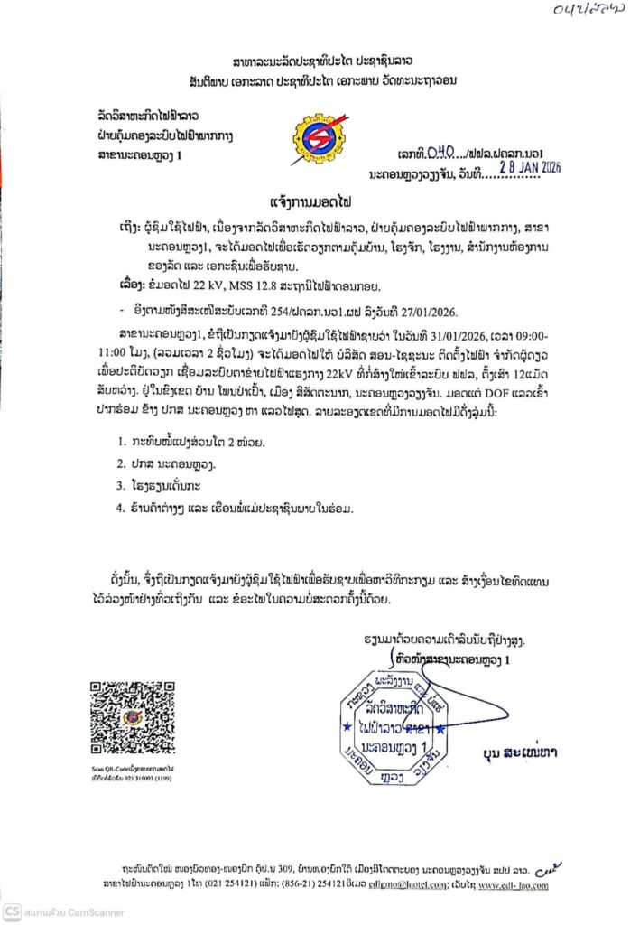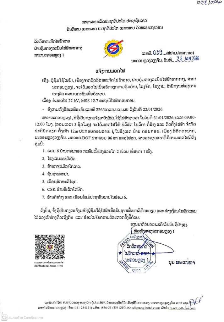 ແຈ້ງການ ແຈ້ງການມອດໄຟວັນທີ 31/01/2026 By Pele ທີ 28 January, 2026 0 360 Share FacebookTwitterPinterestWhatsApp Must read ຮູບແບບການຫລອກລວງທາງອອນລາຍຂອງແກ້ງສະແກັມເມີ້ ທີ່ປາກົດໃຫ້ເຫັນໃນສັງຄົມລາວ ທີ 20 February, 2026 ເກີດອຸບັດເຫດລົດເກາະສາຍໄຟຟ້າ ເຂດ ບ້ານດົງໂພນເລົາ ເມືອງຫາດຊາຍຟອງ ນະຄອນຫຼວງວຽງຈັນ. ທີ 20 February, 2026 ຮອງລັດຖະມົນຕີກະຊວງປ້ອງປະເທດ ລົງຢ້ຽມຢາມທີມງານພາກສະໜາມກວດກູ້ ແລະ ທຳລາຍລະເບີດ ລາວ-ຣັດເຊຍ ຢູ່ແຂວງຫົວພັນ ທີ 20 February, 2026 ຈີນໂຊຄວາມລ້ຳສະໄໝ ກອງທັບໜຸ່ນຍົນຮິວແມນນອຍດ໌ລັກຊີນ ງານກາລ້າກຸດຈີນ 2026 ທີ 20 February, 2026 Pele ທີ່ມາ:EDL LAOS ລັດວິສາຫະກິດໄຟຟ້າລາວ ສາຂານະຄອນຫຼວງ1 Share FacebookTwitterPinterestWhatsApp Previous articleລາຍງານສະພາບອາກາດປະຈໍາວັນທີ 28 ມັງກອນ ປີ 2026Next articleເລຂາທິການໃຫຍ່ ປະທານປະເທດລາວ ສືບຕໍ່ເຄື່ອນໄຫວຢ້ຽມຢາມລັດຖະກິດ ຢູ່ ຫວຽດນາມ More articles ແຈ້ງການມອດໄຟ ວັນທີ 21/2/2026 ລາຍລະອຽດດັ່ງນີ້ ທີ 19 February, 2026 ເເຈ້ງປັບລົງລາຄານ້ຳມັນເຊື້ອໄຟເລິ່ມປະຕິບັດ 06:00 ໂມງຂອງວັນທີ 19/02/2026 ຕາມແຈ້ງການດັ່ງນີ້ ທີ 19 February, 2026 ແຂວງວຽງຈັນ ຫ້າມເດັດຂາດ! ບໍ່ໃຫ້ເຈົ້າໜ້າທີ່ ຕມ ປະຈຳຢູ່ດ່ານຊາຍແດນປັບໃໝ ກໍລະນີກວດພົບເອກະສານເດີນທາງໝົດອາຍຸ ເລີ່ມວັນທີ 14-22 ກຸມພາ 2026 ທີ 16 February, 2026 LEAVE A REPLY Cancel reply Comment: Please enter your comment! Name:* Please enter your name here Email:* You have entered an incorrect email address! Please enter your email address here Website: Save my name, email, and website in this browser for the next time I comment. - Advertisement - Latest article ຮູບແບບການຫລອກລວງທາງອອນລາຍຂອງແກ້ງສະແກັມເມີ້ ທີ່ປາກົດໃຫ້ເຫັນໃນສັງຄົມລາວ ທີ 20 February, 2026 ເກີດອຸບັດເຫດລົດເກາະສາຍໄຟຟ້າ ເຂດ ບ້ານດົງໂພນເລົາ ເມືອງຫາດຊາຍຟອງ ນະຄອນຫຼວງວຽງຈັນ. ທີ 20 February, 2026 ຮອງລັດຖະມົນຕີກະຊວງປ້ອງປະເທດ ລົງຢ້ຽມຢາມທີມງານພາກສະໜາມກວດກູ້ ແລະ ທຳລາຍລະເບີດ ລາວ-ຣັດເຊຍ ຢູ່ແຂວງຫົວພັນ ທີ 20 February, 2026 ຈີນໂຊຄວາມລ້ຳສະໄໝ ກອງທັບໜຸ່ນຍົນຮິວແມນນອຍດ໌ລັກຊີນ ງານກາລ້າກຸດຈີນ 2026 ທີ 20 February, 2026 ໜ້າເສຍດາຍ!! ເຮືອໄມ້ໃຫຍ່ ນາກາຍ ແຂວງຄຳມ່ວນ ຖືກໄຟໄໝ້ເສຍຫາຍໝົດລຳ ເຫລືອໄວ້ແຕ່ພຽງຊົງຈຳ ທີ 20 February, 2026