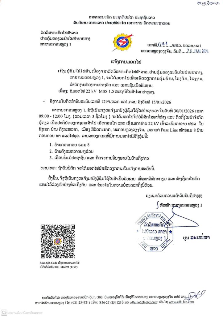 ແຈ້ງການ ແຈ້ງການມອດໄຟ ວັນທີ 30, 31/01/2026 By Pele ທີ 28 January, 2026 0 357 Share FacebookTwitterPinterestWhatsApp Must read ຮູບແບບການຫລອກລວງທາງອອນລາຍຂອງແກ້ງສະແກັມເມີ້ ທີ່ປາກົດໃຫ້ເຫັນໃນສັງຄົມລາວ ທີ 20 February, 2026 ເກີດອຸບັດເຫດລົດເກາະສາຍໄຟຟ້າ ເຂດ ບ້ານດົງໂພນເລົາ ເມືອງຫາດຊາຍຟອງ ນະຄອນຫຼວງວຽງຈັນ. ທີ 20 February, 2026 ຮອງລັດຖະມົນຕີກະຊວງປ້ອງປະເທດ ລົງຢ້ຽມຢາມທີມງານພາກສະໜາມກວດກູ້ ແລະ ທຳລາຍລະເບີດ ລາວ-ຣັດເຊຍ ຢູ່ແຂວງຫົວພັນ ທີ 20 February, 2026 ຈີນໂຊຄວາມລ້ຳສະໄໝ ກອງທັບໜຸ່ນຍົນຮິວແມນນອຍດ໌ລັກຊີນ ງານກາລ້າກຸດຈີນ 2026 ທີ 20 February, 2026 Pele ທີ່ມາ:EDL LAOS ລັດວິສາຫະກິດໄຟຟ້າລາວ ສາຂານະຄອນຫຼວງ1 Share FacebookTwitterPinterestWhatsApp Previous articleມອບ-ຮັບໜ້າທີ່ເລຂາຄະນະບໍລິຫານງານພັກ ລັດຖະມົນຕີກະຊວງປ້ອງກັນຄວາມສະຫງົບNext articleລາຍງານສະພາບອາກາດປະຈໍາວັນທີ 29 ມັງກອນ ປີ 2026 More articles ແຈ້ງການມອດໄຟ ວັນທີ 21/2/2026 ລາຍລະອຽດດັ່ງນີ້ ທີ 19 February, 2026 ເເຈ້ງປັບລົງລາຄານ້ຳມັນເຊື້ອໄຟເລິ່ມປະຕິບັດ 06:00 ໂມງຂອງວັນທີ 19/02/2026 ຕາມແຈ້ງການດັ່ງນີ້ ທີ 19 February, 2026 ແຂວງວຽງຈັນ ຫ້າມເດັດຂາດ! ບໍ່ໃຫ້ເຈົ້າໜ້າທີ່ ຕມ ປະຈຳຢູ່ດ່ານຊາຍແດນປັບໃໝ ກໍລະນີກວດພົບເອກະສານເດີນທາງໝົດອາຍຸ ເລີ່ມວັນທີ 14-22 ກຸມພາ 2026 ທີ 16 February, 2026 LEAVE A REPLY Cancel reply Comment: Please enter your comment! Name:* Please enter your name here Email:* You have entered an incorrect email address! Please enter your email address here Website: Save my name, email, and website in this browser for the next time I comment. - Advertisement - Latest article ຮູບແບບການຫລອກລວງທາງອອນລາຍຂອງແກ້ງສະແກັມເມີ້ ທີ່ປາກົດໃຫ້ເຫັນໃນສັງຄົມລາວ ທີ 20 February, 2026 ເກີດອຸບັດເຫດລົດເກາະສາຍໄຟຟ້າ ເຂດ ບ້ານດົງໂພນເລົາ ເມືອງຫາດຊາຍຟອງ ນະຄອນຫຼວງວຽງຈັນ. ທີ 20 February, 2026 ຮອງລັດຖະມົນຕີກະຊວງປ້ອງປະເທດ ລົງຢ້ຽມຢາມທີມງານພາກສະໜາມກວດກູ້ ແລະ ທຳລາຍລະເບີດ ລາວ-ຣັດເຊຍ ຢູ່ແຂວງຫົວພັນ ທີ 20 February, 2026 ຈີນໂຊຄວາມລ້ຳສະໄໝ ກອງທັບໜຸ່ນຍົນຮິວແມນນອຍດ໌ລັກຊີນ ງານກາລ້າກຸດຈີນ 2026 ທີ 20 February, 2026 ໜ້າເສຍດາຍ!! ເຮືອໄມ້ໃຫຍ່ ນາກາຍ ແຂວງຄຳມ່ວນ ຖືກໄຟໄໝ້ເສຍຫາຍໝົດລຳ ເຫລືອໄວ້ແຕ່ພຽງຊົງຈຳ ທີ 20 February, 2026