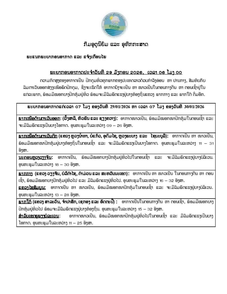 ນະຄອນຫລວງວຽງຈັນ: ອາກາດເຢັນ, ້ພ້ອມມີໝອກບາງປົກຫຸ້ມຢູ່ທົ່ວໄປໃນຕອນເຊົ້າ ແລະ ຈະມີລົມພັດແຮງຢູ່ບາງບໍລິເວນ ອຸນຫະພູມໃນລະຫວ່າງ 18–30 ອົງສາ.