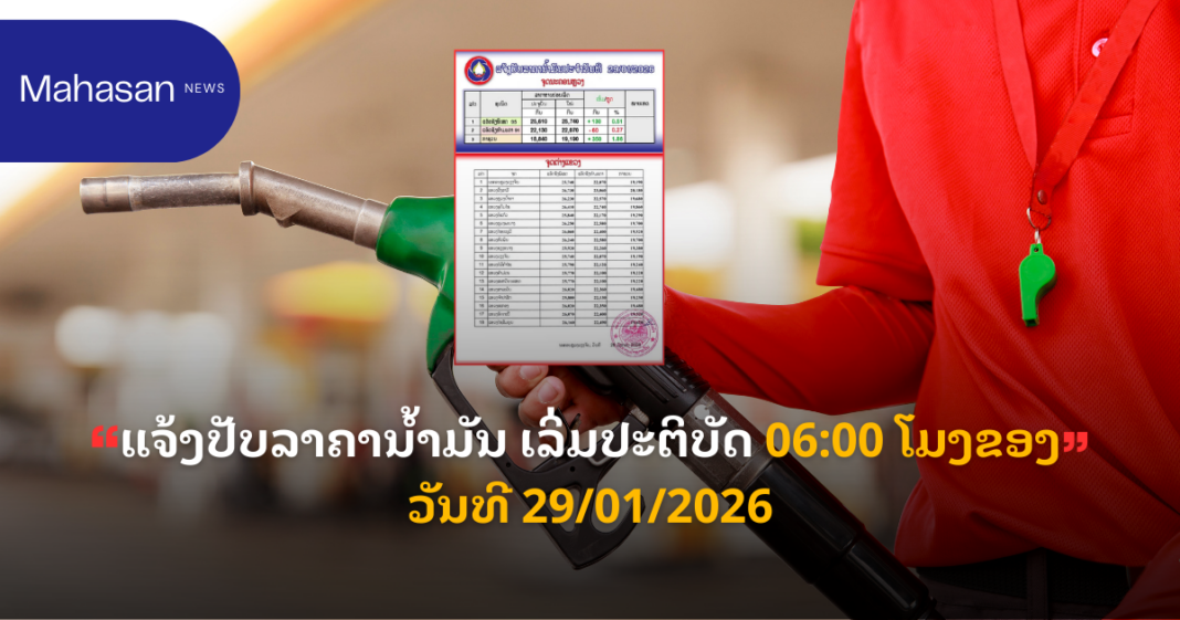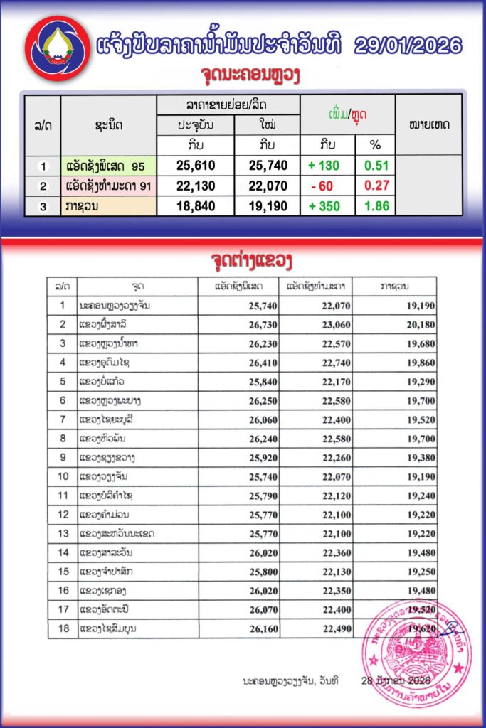 ແຈ້ງການ ແຈ້ງປັບລາຄານ້ຳມັນ ເລິ່ມປະຕິບັດ 06:00 ໂມງຂອງວັນທີ 29/01/2026 By Pele ທີ 29 January, 2026 0 287 Share FacebookTwitterPinterestWhatsApp Must read ຮູບແບບການຫລອກລວງທາງອອນລາຍຂອງແກ້ງສະແກັມເມີ້ ທີ່ປາກົດໃຫ້ເຫັນໃນສັງຄົມລາວ ທີ 20 February, 2026 ເກີດອຸບັດເຫດລົດເກາະສາຍໄຟຟ້າ ເຂດ ບ້ານດົງໂພນເລົາ ເມືອງຫາດຊາຍຟອງ ນະຄອນຫຼວງວຽງຈັນ. ທີ 20 February, 2026 ຮອງລັດຖະມົນຕີກະຊວງປ້ອງປະເທດ ລົງຢ້ຽມຢາມທີມງານພາກສະໜາມກວດກູ້ ແລະ ທຳລາຍລະເບີດ ລາວ-ຣັດເຊຍ ຢູ່ແຂວງຫົວພັນ ທີ 20 February, 2026 ຈີນໂຊຄວາມລ້ຳສະໄໝ ກອງທັບໜຸ່ນຍົນຮິວແມນນອຍດ໌ລັກຊີນ ງານກາລ້າກຸດຈີນ 2026 ທີ 20 February, 2026 Pele ແຈ້ງປັບລາຄານ້ຳມັນ ເລິ່ມປະຕິບັດ 06:00 ໂມງຂອງວັນທີ 29/01/2026 ຕາມແຈ້ງການຈາກ ກຊ ອຸດສະຫະກຳແລະການຄ້າ ເລກທີ 0164/ກຄພນ ລົງວັນທີ 28.ມກ. 2026 ທີ່ມາ:LAO STATE FUEL COMPANY (LSFC) ລັດວິສາຫະກິດ ນໍ້າມັນເຊຶ້ອໄຟລາວ (ລນລ) Share FacebookTwitterPinterestWhatsApp Previous articleແຂວງຈໍາປາສັກ ຢຶດລິ່ນຢູ່ລົດເມໂດຍສານ ອັດຕະປື-ນະຄອນຫລວງວຽງຈັນ ພ້ອມປ່ອຍຄືນສູ່ທໍາມະຊາດNext articleເກີດເຫດ ເຮືອບິນ Beechcraft 1900D ຖ້ຽວບິນ HK-4709 ຂອງສາຍການບິນລັດ Satena ປະສົບອຸບັດຕິເຫດຕົກໃນ ວັນທີ 28.01.2026 ຜູ້ໂດຍສານ ແລະ ລູກເຮືອທັງລວມ 15 ຄົນເສຍຊີວິດທັງໝົດ. More articles ແຈ້ງການມອດໄຟ ວັນທີ 21/2/2026 ລາຍລະອຽດດັ່ງນີ້ ທີ 19 February, 2026 ເເຈ້ງປັບລົງລາຄານ້ຳມັນເຊື້ອໄຟເລິ່ມປະຕິບັດ 06:00 ໂມງຂອງວັນທີ 19/02/2026 ຕາມແຈ້ງການດັ່ງນີ້ ທີ 19 February, 2026 ແຂວງວຽງຈັນ ຫ້າມເດັດຂາດ! ບໍ່ໃຫ້ເຈົ້າໜ້າທີ່ ຕມ ປະຈຳຢູ່ດ່ານຊາຍແດນປັບໃໝ ກໍລະນີກວດພົບເອກະສານເດີນທາງໝົດອາຍຸ ເລີ່ມວັນທີ 14-22 ກຸມພາ 2026 ທີ 16 February, 2026 LEAVE A REPLY Cancel reply Comment: Please enter your comment! Name:* Please enter your name here Email:* You have entered an incorrect email address! Please enter your email address here Website: Save my name, email, and website in this browser for the next time I comment. - Advertisement - Latest article ຮູບແບບການຫລອກລວງທາງອອນລາຍຂອງແກ້ງສະແກັມເມີ້ ທີ່ປາກົດໃຫ້ເຫັນໃນສັງຄົມລາວ ທີ 20 February, 2026 ເກີດອຸບັດເຫດລົດເກາະສາຍໄຟຟ້າ ເຂດ ບ້ານດົງໂພນເລົາ ເມືອງຫາດຊາຍຟອງ ນະຄອນຫຼວງວຽງຈັນ. ທີ 20 February, 2026 ຮອງລັດຖະມົນຕີກະຊວງປ້ອງປະເທດ ລົງຢ້ຽມຢາມທີມງານພາກສະໜາມກວດກູ້ ແລະ ທຳລາຍລະເບີດ ລາວ-ຣັດເຊຍ ຢູ່ແຂວງຫົວພັນ ທີ 20 February, 2026 ຈີນໂຊຄວາມລ້ຳສະໄໝ ກອງທັບໜຸ່ນຍົນຮິວແມນນອຍດ໌ລັກຊີນ ງານກາລ້າກຸດຈີນ 2026 ທີ 20 February, 2026 ໜ້າເສຍດາຍ!! ເຮືອໄມ້ໃຫຍ່ ນາກາຍ ແຂວງຄຳມ່ວນ ຖືກໄຟໄໝ້ເສຍຫາຍໝົດລຳ ເຫລືອໄວ້ແຕ່ພຽງຊົງຈຳ ທີ 20 February, 2026