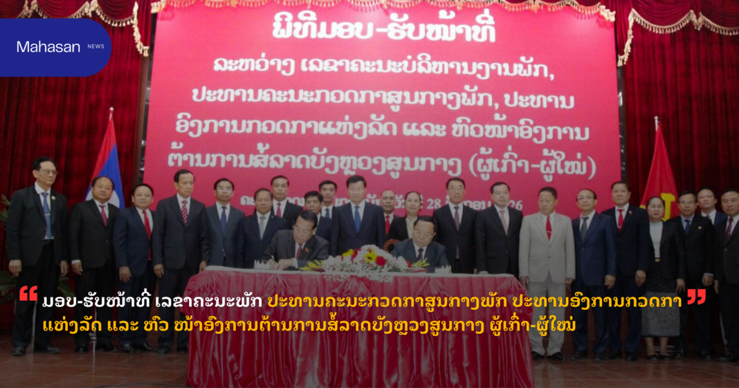ຫຼັງຈາກນັ້ນ, ສະຫາຍ ທອງລຸນ ສີສຸລິດ ກໍໄດ້ໃຫ້ກຽດມອບຄຳສັ່ງຂອງກົມການເມືອງສູນກາງພັກ ສະບັບເລກທີ 02/ກມສພ, ລົງວັນທີ 16 ມັງກອນ 2026 ວ່າດ້ວຍການຍົກຍ້າຍພະນັກງານການນຳຂັ້ນສູງໄປຮັບໜ້າທີ່ໃໝ່ ໃຫ້ ສະຫາຍ ຄຳພັນ ພົມມະທັດ; ມະຕິຕົກລົງຂອງກົມການເມືອງສູນກາງພັກ ສະບັບເລກທີ 11/ກມສພ,ລົງວັນທີ 16 ມັງກອນ 2026 ວ່າດ້ວຍການແຕ່ງຕັ້ງ ເລຂາຄະນະບໍລິ ຫານງານພັກ ປະທານຄະນະກວດກາສູນກາງພັກ ໃຫ້ສະ ຫາຍ ວັນໄຊ ພອງສະຫວັນ.ຈາກນັ້ນ, ກໍໄດ້ມີການເຊັນບົດບັນທຶກມອບ-ຮັບໜ້າທີ່ລະຫວ່າງປະທານຄະນະກວດກາສູນກາງພັກ ປະທານອົງການກວດກາແຫ່ງລັດ ແລະ ຫົວ ໜ້າອົງການຕ້ານການສໍ້ລາດບັງຫຼວງສູນກາງ (ຜູ້ເກົ່າ ແລະ ຜູ້ໃໝ່)