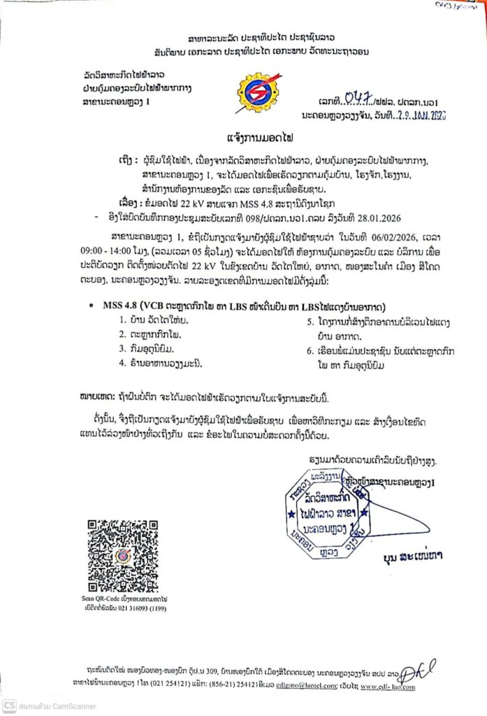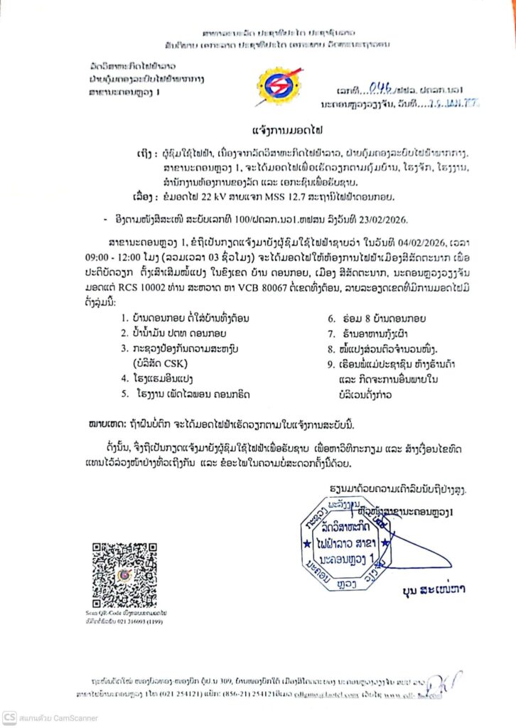 ແຈ້ງການມອດໄຟ ວັນທີ 04,06/02/2026