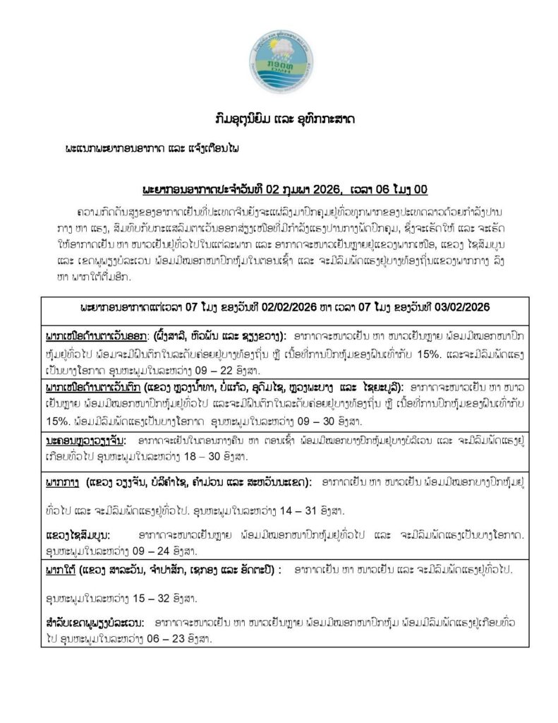 ຄວາມກົດດັນສູງຂອງອາກາດເຢັນທີ່ປະເທດຈີນ ຍັງຈະແຜ່ລົງມາປົກຄຸມຢູູ່ທົົ່ວທຸກພາກຂອງປະເທດລາວ ດ້ວຍກໍາລັງປານກາງ ຫາ ແຮງ, ສົມທົບກັບກະແສລົມຕາເວັນອອກສ່ຽງເໜືອທີ່ມີກໍາລັງແຮງປານກາງພັດປົກຄຸມ, ເຊິ່ງຈະເຮັດໃຫ້ ແລະ ຈະເຮັດໃຫ້ອາກາດເຢັນ ຫາ ໜາວເຢັນຢູູ່ທົ່ວໄປໃນແຕ່ລະພາກ ແລະ ອາກາດຈະໜາວເຢັນຫລາຍຢູູ່ແຂວງພາກເໜືອ, ແຂວງໄຊສົມບູນ ແລະ ເຂດພູພຽງບໍລະເວນ ພ້ອມມີໝອກໜາປົກຫຸ້ມໃນຕອນເຊົ້າ ແລະ ຈະມີລົມພັດແຮງຢູູ່ບາງທ້ອງຖິີ່ນແຂວງພາກກາງ ລົງຫາ ພາກໃຕ້ ຕື່ມອີກ.