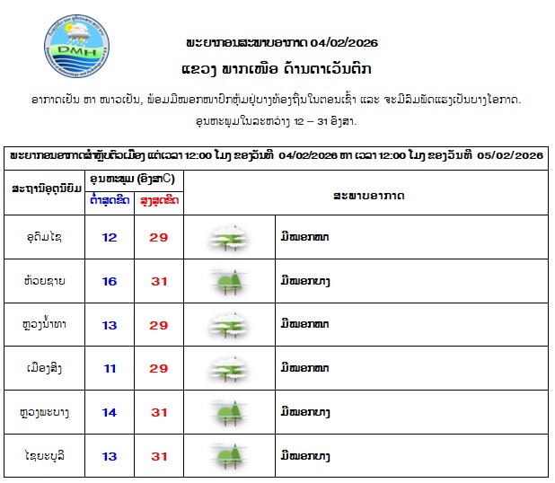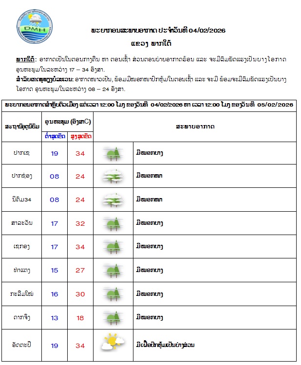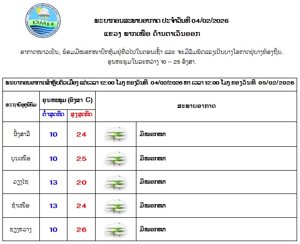 ມວນອາກາດໜາວເຢັນ ຍັງປົກຄຸມຢູ່ທົ່ວທຸກພາກຂອງປະເທດລາວ ດ້ວຍກໍາລັງປານກາງ, ສົມທົບກັບກະແສລົມຕາເວັນອອກ-ຕາເວັນອອກສ່ຽງເໜືອພັດປົກຄຸມ, ເຊິ່ງຈະເຮັດໃຫ້ອາກາດຍັງເຢັນ ຫາ ໜາວເຢັນໃນຕອນກາງຄືນ ຫາ ຕອນເຊົ້າ ພ້ອມທັງມີໝອກໜາປົກຫຸ້ມຢູ່ບາງທ້ອງຖິ່ນໃນຕອນເຊົ້າ ຢູ່ແຂວງພາກເໜືອ, ແຂວງໄຊສົມບຸນ ແລະ ເຂດພູພຽງບໍລະເວນ ແລະ ຈະມີລົມພັດແຮງເປັນບາງໂອກາດຢູ່ບາງທ້ອງຖິ່ນ.