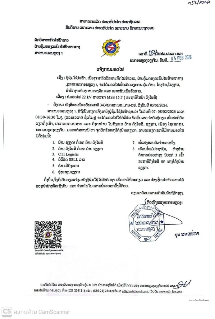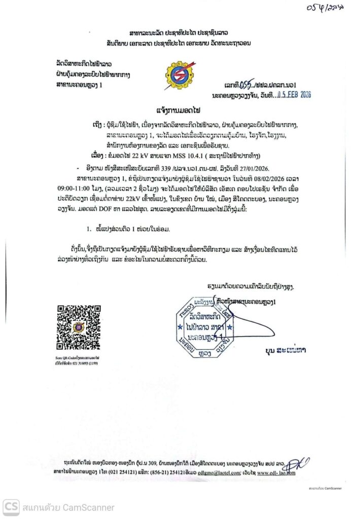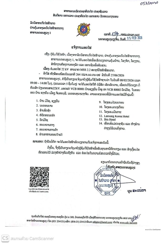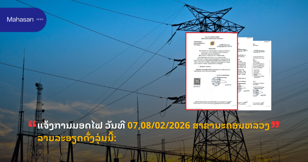 ແຈ້ງການມອດໄຟ ວັນທີ 07,08/02/2026 ສາຂານະຄອນຫລວງ ລາຍລະອຽດດັ່ງລຸ່ມນີ້: