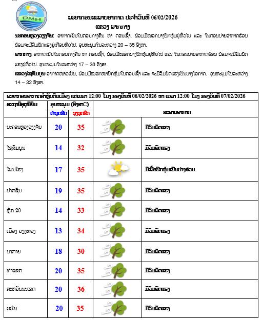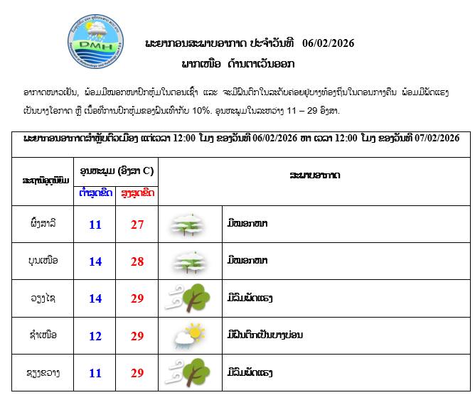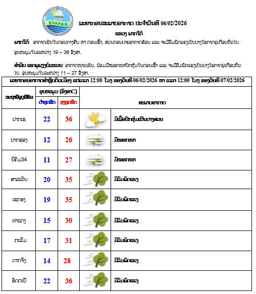 ພະຍາກອນອາກາດ ປະຈໍາວັນທີ 06 ກຸມພາ 2026