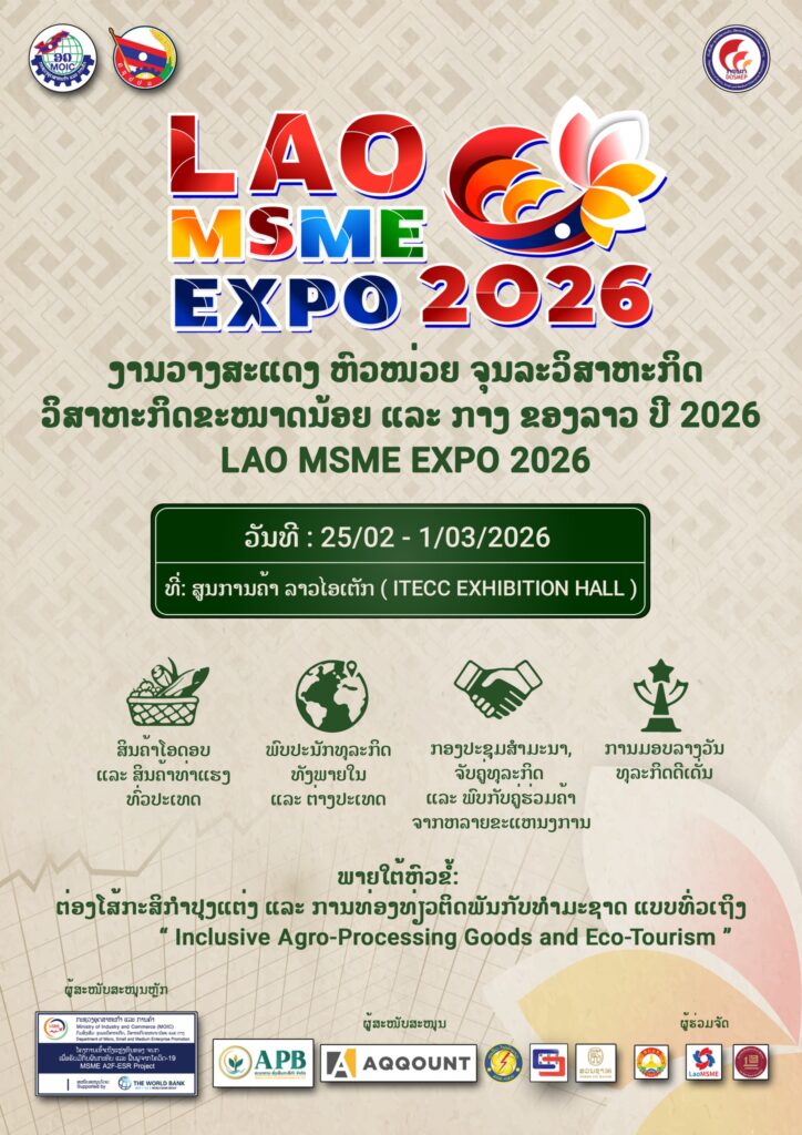 ງານວາງສະແດງ Lao MSME Expo 2026 ເຊິ່ງເປັນງານທໍາອິດ (ຄັ້ງທີ I) ທີ່ກົມສົ່ງເສີມຈຸນລະວິສາຫະກິດ, ວິສາຫະກິດຂະໜາດນ້ອຍ ແລະ ກາງ ຈະໄດ້ຈັດຂຶ້ນຮ່ວມກັບ ສູນກາງຊາວໜຸ່ມປະຊາຊົນ ປະຕິວັດລາວ ແລະ ຮ່ວມກັບບັນດາຂະແໜງການທີ່ກ່ຽວຂ້ອງ ເປັນຕົ້ນແມ່ນ ສະມາຄົມສົ່ງເສີມ MSMEs, ສະມາຄົມສົ່ງເສີມຜະລິດຕະພັນລາວ ແລະ ໂຄງການ MSMEs A2F – ESR. ເຊິ່ງງານດັ່ງກ່າວ ແມ່ນຈະຈັດຈັດຂຶ້ນບົນພື້ນຖານຄວາມຮຽກຮ້ອງຕ້ອງການ ຂອງພາກທຸລະກິດ MSMEs ໃນຂອບເຂດທົ່ວປະເທດ ເພື່ອເປັນບ່ອນແລກປ່ຽນຊື້ – ຂາຍ, ຖອດຖອນບົດຮຽນ, ເປັນບ່ອນໂຄສະນາເຜີຍແຜ່ຜະລິດຕະສິນຄ້າ ແລະ ວັດທະນະທໍາອັນໂດດເດັ່ນ ທີ່ເປັນອັນເອກອ້າງ ແລະ ພາກພູມໃຈຂອງຜູ້ປະກອບການ MSMEs ໃນ ສປປ ລາວ ໃຫ້ແກ່ສັງຄົມ ແລະ ສາກົນໄດ້ຮັບຮູ້ ເຊິ່ງງານວາງສະແດງຈະມີຫ້ອງວາງສະແດງ ທັງໝົດ 250 ຫ້ອງ/ບູດ ເພື່ອສົ່ງເສີມໃຫ້ມີຫົວໜ່ວຍ MSME ທົ່ວປະເທດເຂົ້າຮ່ວມ, ພິເສດການຈັດງານສະແດງໃນຄັ້ງນີ້ ທາງກົມ ຮ່ວມກັບ ທາງຄະະນະຮັບຜິດຊອບງານ ຈະຈັດສັນຫ້ອງວາງສະແດງໃຫ້ແກ່ຕາງໜ້າ 17 ແຂວງ ແລະ ນະຄອນຫຼວງ.