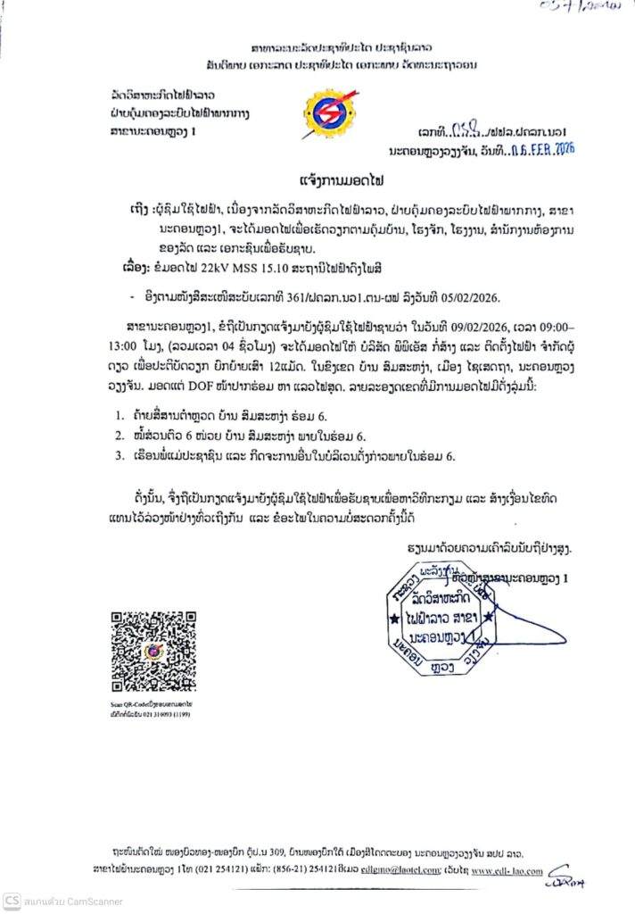 ແຈ້ງການ ແຈ້ງການມອດໄຟ ວັນທີ 08,09/02/2026 By Jenjila ທີ 6 February, 2026 0 221 Share FacebookTwitterPinterestWhatsApp Must read ຮູບແບບການຫລອກລວງທາງອອນລາຍຂອງແກ້ງສະແກັມເມີ້ ທີ່ປາກົດໃຫ້ເຫັນໃນສັງຄົມລາວ ທີ 20 February, 2026 ເກີດອຸບັດເຫດລົດເກາະສາຍໄຟຟ້າ ເຂດ ບ້ານດົງໂພນເລົາ ເມືອງຫາດຊາຍຟອງ ນະຄອນຫຼວງວຽງຈັນ. ທີ 20 February, 2026 ຮອງລັດຖະມົນຕີກະຊວງປ້ອງປະເທດ ລົງຢ້ຽມຢາມທີມງານພາກສະໜາມກວດກູ້ ແລະ ທຳລາຍລະເບີດ ລາວ-ຣັດເຊຍ ຢູ່ແຂວງຫົວພັນ ທີ 20 February, 2026 ຈີນໂຊຄວາມລ້ຳສະໄໝ ກອງທັບໜຸ່ນຍົນຮິວແມນນອຍດ໌ລັກຊີນ ງານກາລ້າກຸດຈີນ 2026 ທີ 20 February, 2026 Jenjila ແຈ້ງການມອດໄຟ ວັນທີ 08,09/02/2026 ລາຍລະອຽດດັ່ງລຸ່ມນີ້: Share FacebookTwitterPinterestWhatsApp Previous articleພິທີຖະແຫຼ່ງຂ່າວງານວາງສະແດງສິນຄ້າ ຈຸນລະວິສາຫະກິດ, ວິສາຫະກິດຂະໜາດນ້ອຍ ແລະ ກາງ ປີ 2026 “Lao MSMEs Expo 2026.Next articleສສຊ ເຂດ 1 ນວ ພົບປະຜູ້ມີສິດເລືອກຕັ້ງໃນວັນທີ 6 ກຸມພານີ້ More articles ແຈ້ງການມອດໄຟ ວັນທີ 21/2/2026 ລາຍລະອຽດດັ່ງນີ້ ທີ 19 February, 2026 ເເຈ້ງປັບລົງລາຄານ້ຳມັນເຊື້ອໄຟເລິ່ມປະຕິບັດ 06:00 ໂມງຂອງວັນທີ 19/02/2026 ຕາມແຈ້ງການດັ່ງນີ້ ທີ 19 February, 2026 ແຂວງວຽງຈັນ ຫ້າມເດັດຂາດ! ບໍ່ໃຫ້ເຈົ້າໜ້າທີ່ ຕມ ປະຈຳຢູ່ດ່ານຊາຍແດນປັບໃໝ ກໍລະນີກວດພົບເອກະສານເດີນທາງໝົດອາຍຸ ເລີ່ມວັນທີ 14-22 ກຸມພາ 2026 ທີ 16 February, 2026 LEAVE A REPLY Cancel reply Comment: Please enter your comment! Name:* Please enter your name here Email:* You have entered an incorrect email address! Please enter your email address here Website: Save my name, email, and website in this browser for the next time I comment. - Advertisement - Latest article ຮູບແບບການຫລອກລວງທາງອອນລາຍຂອງແກ້ງສະແກັມເມີ້ ທີ່ປາກົດໃຫ້ເຫັນໃນສັງຄົມລາວ ທີ 20 February, 2026 ເກີດອຸບັດເຫດລົດເກາະສາຍໄຟຟ້າ ເຂດ ບ້ານດົງໂພນເລົາ ເມືອງຫາດຊາຍຟອງ ນະຄອນຫຼວງວຽງຈັນ. ທີ 20 February, 2026 ຮອງລັດຖະມົນຕີກະຊວງປ້ອງປະເທດ ລົງຢ້ຽມຢາມທີມງານພາກສະໜາມກວດກູ້ ແລະ ທຳລາຍລະເບີດ ລາວ-ຣັດເຊຍ ຢູ່ແຂວງຫົວພັນ ທີ 20 February, 2026 ຈີນໂຊຄວາມລ້ຳສະໄໝ ກອງທັບໜຸ່ນຍົນຮິວແມນນອຍດ໌ລັກຊີນ ງານກາລ້າກຸດຈີນ 2026 ທີ 20 February, 2026 ໜ້າເສຍດາຍ!! ເຮືອໄມ້ໃຫຍ່ ນາກາຍ ແຂວງຄຳມ່ວນ ຖືກໄຟໄໝ້ເສຍຫາຍໝົດລຳ ເຫລືອໄວ້ແຕ່ພຽງຊົງຈຳ ທີ 20 February, 2026