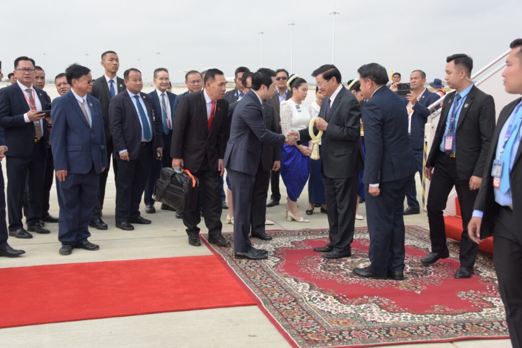 ພິທີຕ້ອນຮັບຢູ່ສະໜາມບິນ ໄດ້ຈັດຂຶ້ນຢ່າງອົບອຸ່ນ ແລະ ສົມກຽດ ໂດຍມີ ທ່ານ ເຈຍ ຮົນ ທີ່ປຶກສາສູງສຸດຂອງເຈົ້າຊີວິດ, ທ່ານ ສົກ ໂສເກັນ ລັດຖະມົນຕີກະຊວງກວດກາ ແຫ່ງ ຣາຊະອາ ນາຈັກ ກໍາປູເຈຍ (ລັດຖະມົນຕີກຽດຕິຍົດ) ແລະ ທ່ານ ບົວແກ້ວ ພູມວົງໄຊ ເອກອັກຄະລັດຖະທູດ ແຫ່ງ ສປປ ລາວ ປະຈໍາ ຣາຊະອານາຈັກກຳປູເຈຍ ພ້ອມດ້ວຍຄະນະທີ່ກ່ຽວຂ້ອງຂອງທັງສອງຝ່າຍ ໃຫ້ການຕ້ອນຮັບ.