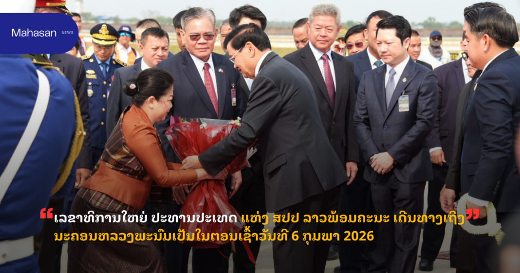 ຂປລ. ໃນຕອນເຊົ້າວັນທີ 6 ກຸມພາ 2026 ນີ້, ທ່ານ ທອງລຸນ ສີສຸລິດ ເລຂາທິການໃຫຍ່ຄະນະບໍລິຫານງານສູນກາງພັກປະຊາຊົນປະຕິວັດລາວ, ປະທານປະເທດ ແຫ່ງ ສປປ ລາວ ພ້ອມດ້ວຍຄະນະຜູ້ແທນຂັ້ນສູງ ສປປ ລາວ ໄດ້ເດີນທາງເຖິງສະໜາມບິນສາກົນເຕໂຈ ນະຄອນຫລວງພະນົມເປັນ ຣາຊະອານາຈັກກຳປູເຈຍ ເພື່ອດໍາເນີນການຢ້ຽມຢາມລັດຖະກິດ ຢູ່ຣາຊະອານາຈັກກຳປູເຈຍ ແຕ່ວັນທີ 6-7 ກຸມພາ 2026.