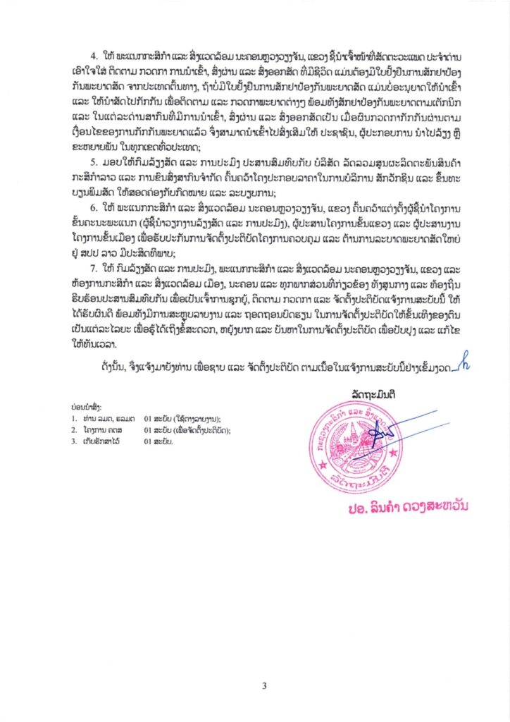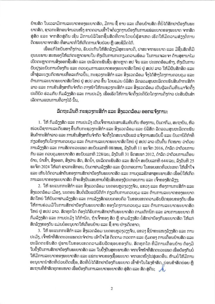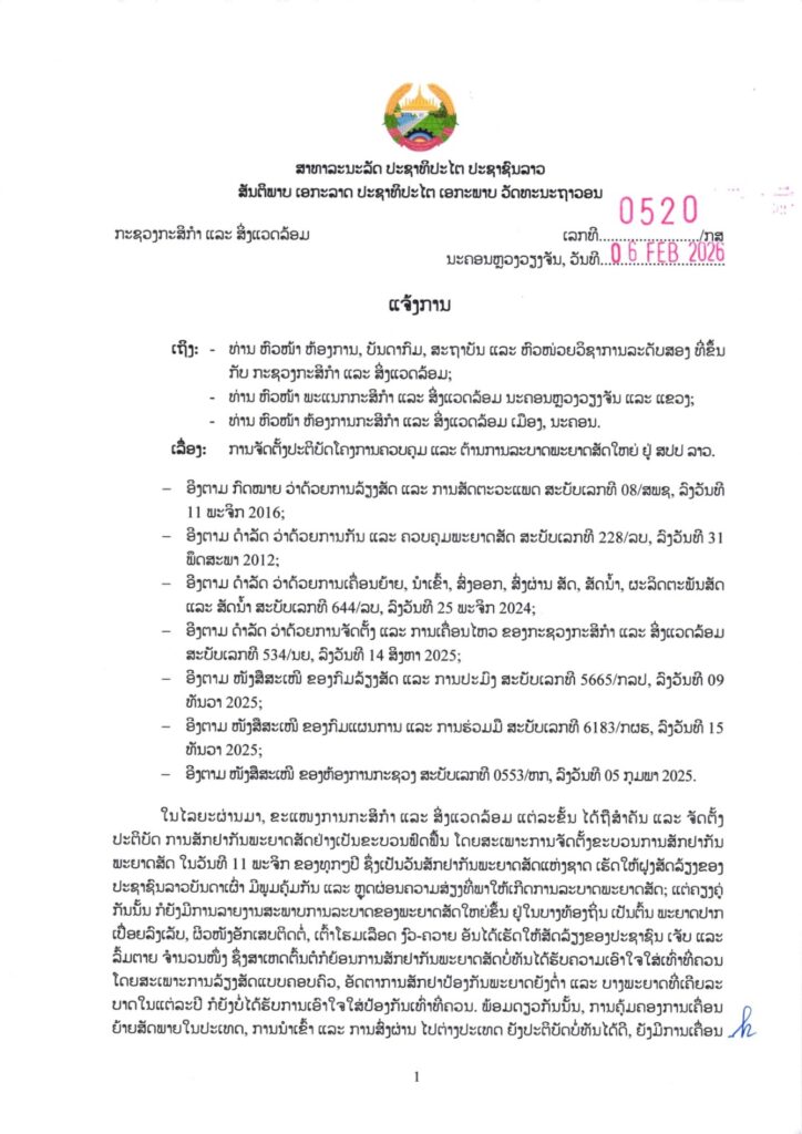 ວັນທີ 6 ກຸມພາ 2026 ກະຊວງກະສິກຳ ແລະ ສິ່ງແວດລ້ອມ ອອກແຈ້ງການ ເລື່ອງ ການຈັດຕັ້ງປະຕິບັດໂຄງການຄວບຄຸມ ແລະ ຕ້ານການລະບາດພະຍາດສັດໃຫຍ່ ຢູ່ ສປປ ລາວ.