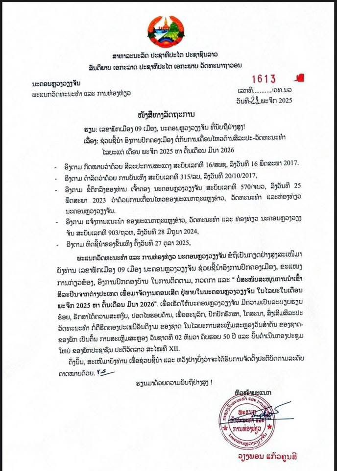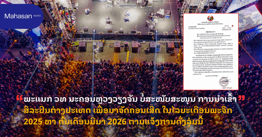 ພະແນກ ວທ ນະຄອນຫຼວງວຽງຈັນ ອອກແຈ້ງການ ໂດຍມີເນື້ອໃນ ບໍ່ສະໜັບສະໜຸນ ການນຳເຂົ້າສິລະປິນຕ່າງປະເທດ ເພື່ອມາຈັດຄອນເສີດ ໃນໄລຍະເດືອນພະຈິກ 2025 ຫາ ຕົ້ນເດືອນມີນາ 2026 ຕາມແຈ້ງການດັ່ງລຸ່ມນີ້: