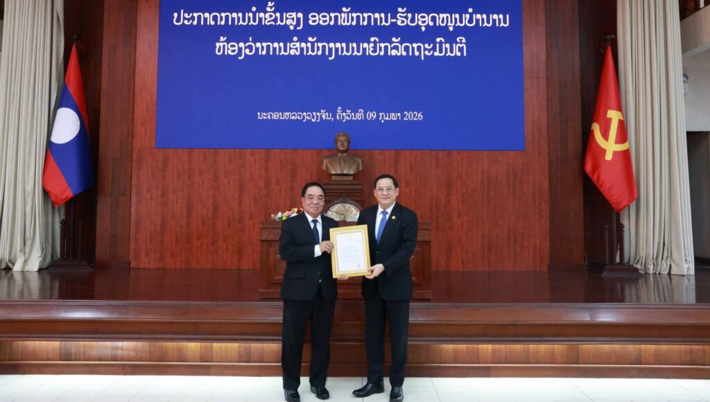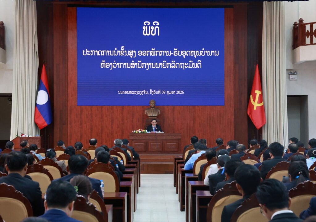 ຂປລ. ໃນວັນທີ 9 ກຸມພາ 2026 ຫ້ອງວ່າການສໍານັກງານນາຍົກລັດຖະມົນຕີ (ຫສນຍ) ຈັດພິທີປະກາດການນຳຂັ້ນສູງ ອອກພັກການ-ຮັບອຸດໜູນບຳນານ ໂດຍໃຫ້ກຽດເປັນປະທານຂອງທ່ານ ສອນໄຊ ສີພັນດອນ ນາຍົກລັດຖະມົນຕີ, ມີລັດຖະມົນຕີ, ຫົວໜ້າ ຫສນຍ, ບັນດາທ່ານລັດຖະມົນຕີ ປະຈຳສຳນັກງານາຍົກລັດຖະມົນຕີ, ຜູ້ຕາງໜ້າຄະນະຈັດຕັ້ງສູນກາງພັກ ພ້ອມດ້ວຍພະນັກງານ-ລັດຖະກອນ ພາຍໃນ ຫສນຍ ເຂົ້າຮ່ວມ.