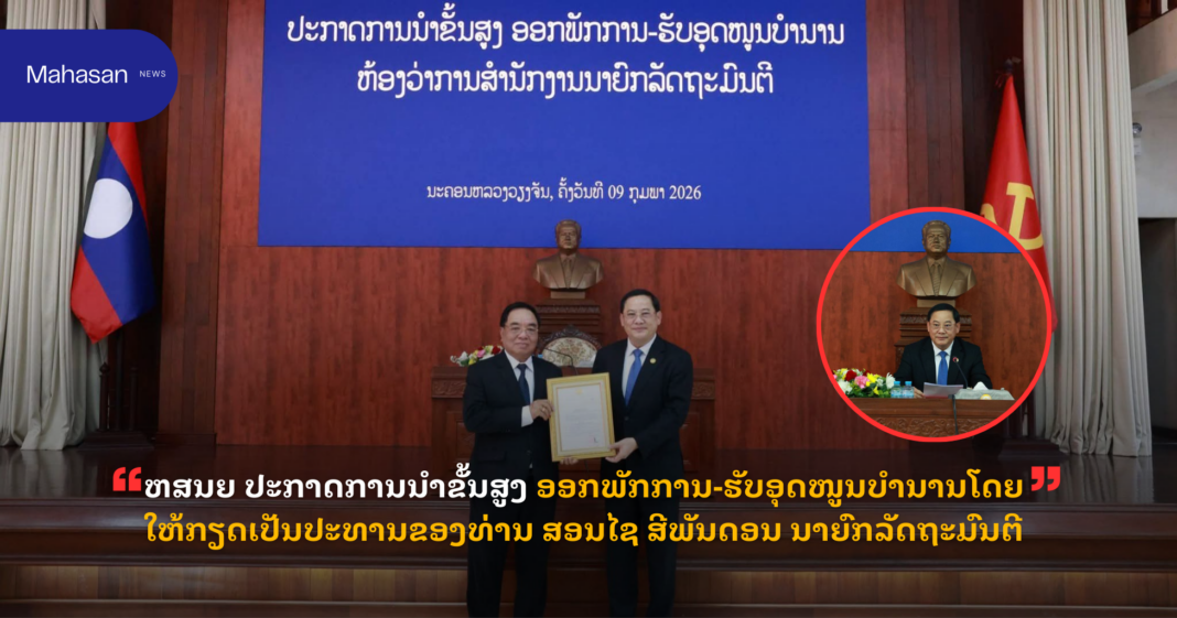 ຂປລ. ໃນວັນທີ 9 ກຸມພາ 2026 ຫ້ອງວ່າການສໍານັກງານນາຍົກລັດຖະມົນຕີ (ຫສນຍ) ຈັດພິທີປະກາດການນຳຂັ້ນສູງ ອອກພັກການ-ຮັບອຸດໜູນບຳນານ ໂດຍໃຫ້ກຽດເປັນປະທານຂອງທ່ານ ສອນໄຊ ສີພັນດອນ ນາຍົກລັດຖະມົນຕີ, ມີລັດຖະມົນຕີ, ຫົວໜ້າ ຫສນຍ, ບັນດາທ່ານລັດຖະມົນຕີ ປະຈຳສຳນັກງານາຍົກລັດຖະມົນຕີ, ຜູ້ຕາງໜ້າຄະນະຈັດຕັ້ງສູນກາງພັກ ພ້ອມດ້ວຍພະນັກງານ-ລັດຖະກອນ ພາຍໃນ ຫສນຍ ເຂົ້າຮ່ວມ.