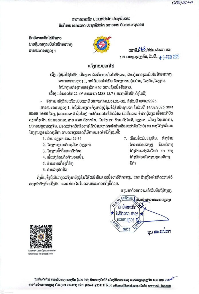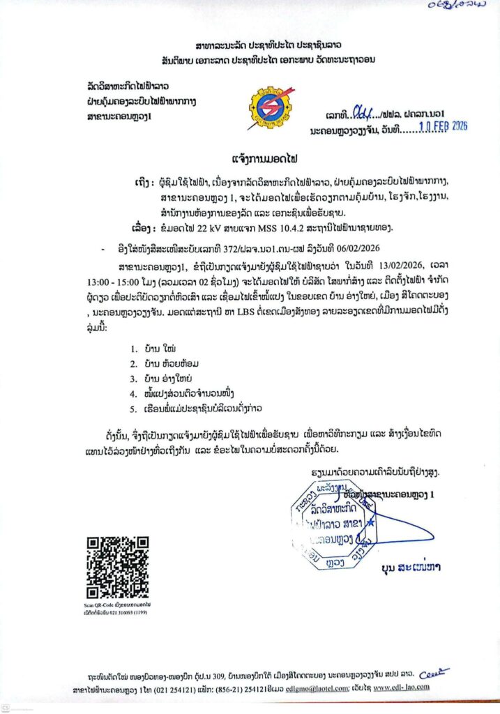 ແຈ້ງການມອດໄຟ ວັນທີ 13/2/2026 ເມືອງ ສີໂຄດຕະບອງ ແລະ ວັນທີ 14-15/2/2026 ເມືອງ ໄຊເສດຖາ