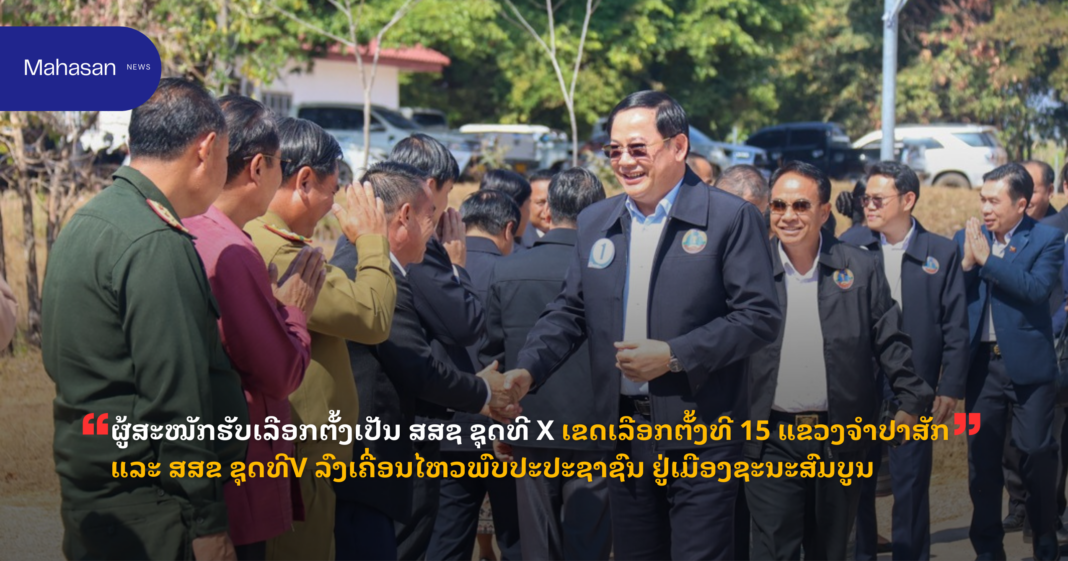 ທ່ານ ສອນໄຊ ສີພັນດອນ ກຳມະການກົມການເມືອງສູນກາງພັກ ນາຍົກລັດຖະມົນຕີແຫ່ງ ສປປ ລາວ ຜູ້ສະໝັກ ສສຊ ຊຸດທີ X ເຂດເລືອກຕັ້ງທີ 15 ແຂວງຈໍາປາສັກ (ນ້ຳເບີ1) ພ້ອມດ້ວຍຄະນະຜູ້ສະໝັກ ສສຊ ທັງ 9 ທ່ານ ແລະ ຜູ້ສະໝັກ ສສຂ ເຂດເລືອກຕັ້ງເມືອງຊະນະສົມບູນ 7 ທ່ານ ນຳໂດຍ ທ່ານ ຄຳສີ ຫຼິນສະຫວາດ ກຳມະການພັກແຂວງ ເລຂາພັກເມືອງ ຊະນະສົມບູນ ຜູ້ສະໝັກນ້ຳເບີ 1 ພ້ອມຄະນະຜູ້ສະໝັກ ຈຳນວນ 6 ທ່ານໄດ້ລົງເຄື່ອນໄຫວພົບປະ ແລະ ສະເໜີຕົວຕໍ່ຜູ້ມີສິດເລືອກຕັ້ງ ເມື່ອມໍ່ໆມານີ້ ຢູ່ທີ່ສະໂມສອນຂອງເມືອງຊະນະສົມບູນ.