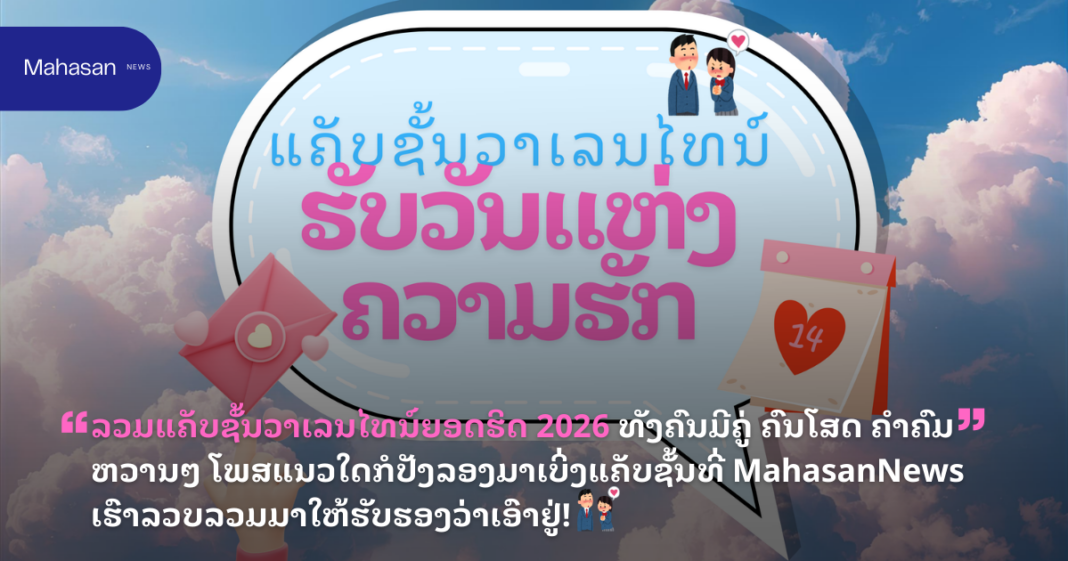 ລວມແຄັບຊັ້ນວາເລນໄທນ໌ຍອດຮິດ 2026 ທັງຄົນມີຄູ່ ຄົນໂສດ ຄຳຄົມຫວານໆ ໂພສແນວໃດກໍປັງລອງມາເບິ່ງແຄັບຊັ້ນທີ່ MahasanNews ເຮົາລວບລວມມາໃຫ້ຮັບຮອງວ່າເອົາຢູ່!
