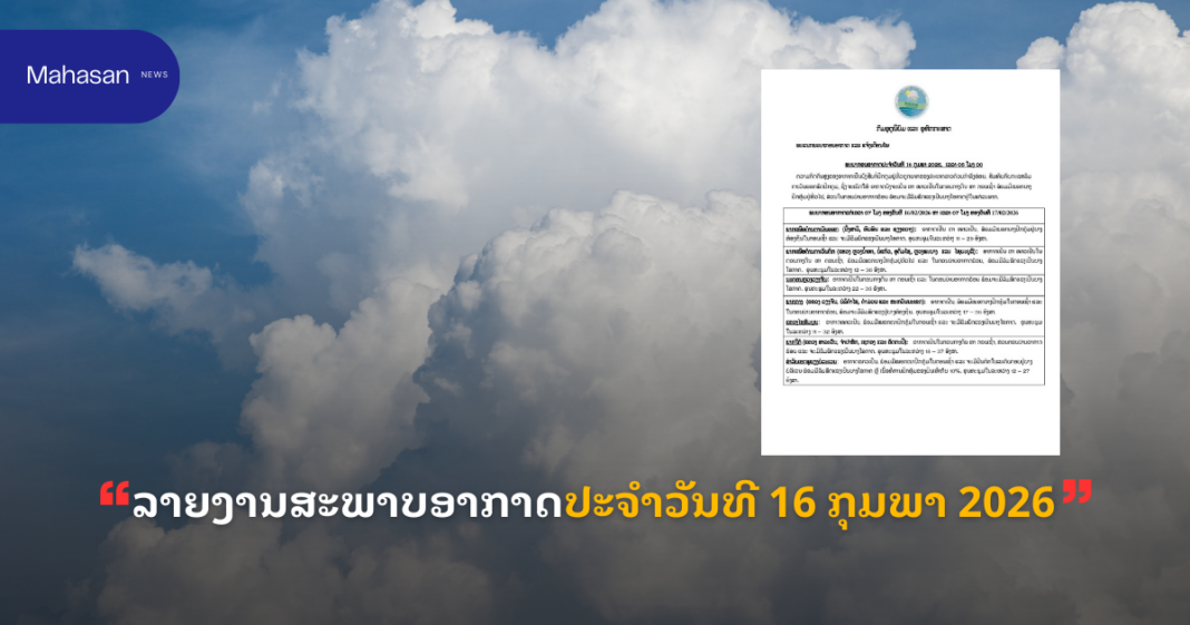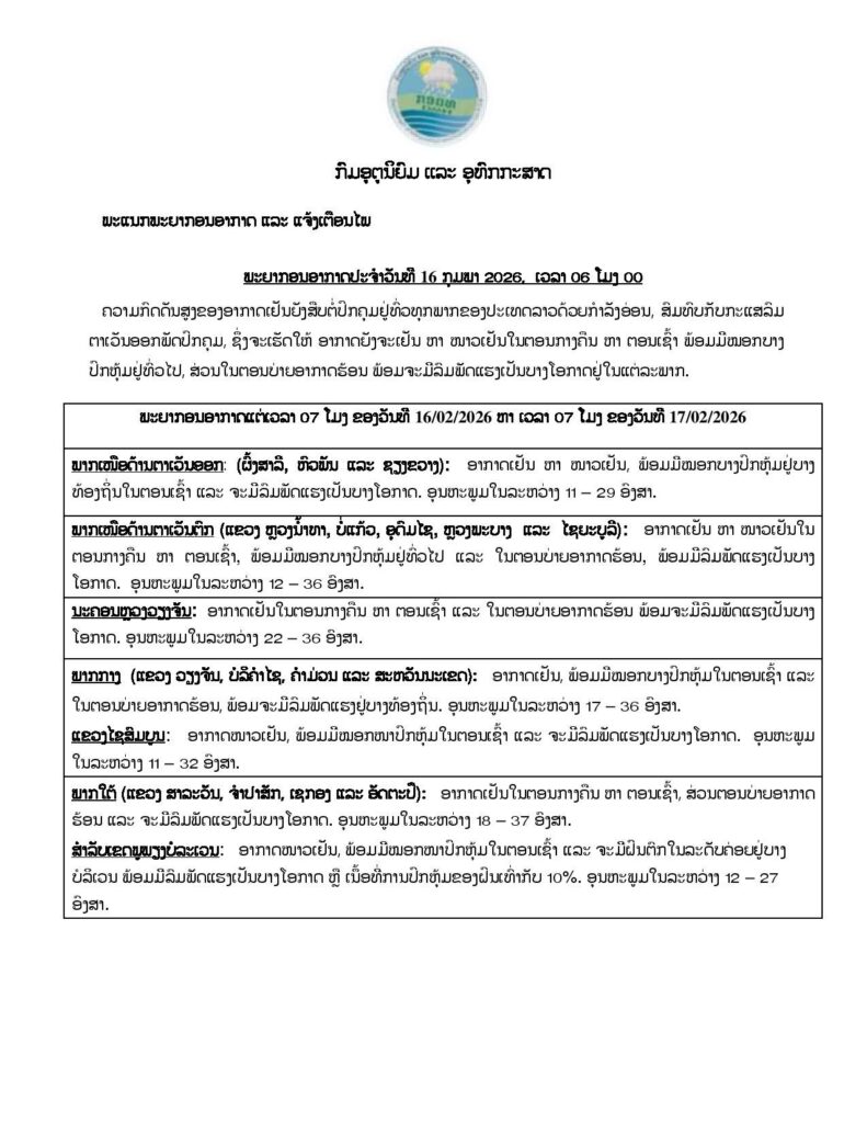 ລາຍງານສະພາບອາກາດປະຈໍາວັນທີ 16 ກຸມພາ 2026
