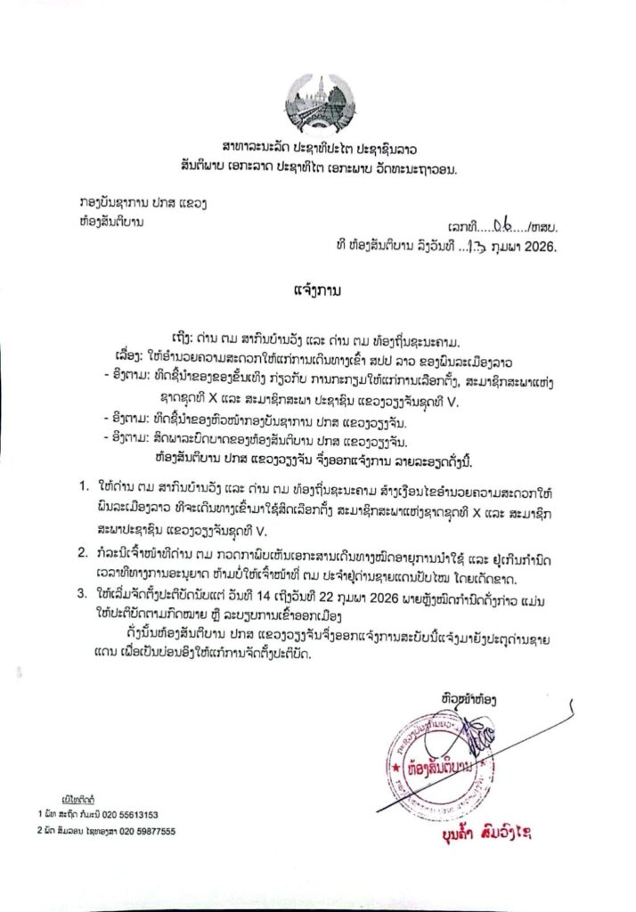 ວັນທີ 13 ກຸມພາ 2026 ຫ້ອງສັນຕິບານ ກອງບັນຊາການ ປກສ ແຂວງວຽງຈັນ ອອກແຈ້ງການ ໃຫ້ອໍານວຍຄວາມສະດວກໃຫ້ແກ່ການເດີນທາງເຂົ້າ ສປປ ລາວ ຂອງພົນລະເມືອງລາວ ລາຍລະອຽດດັ່ງນີ້: