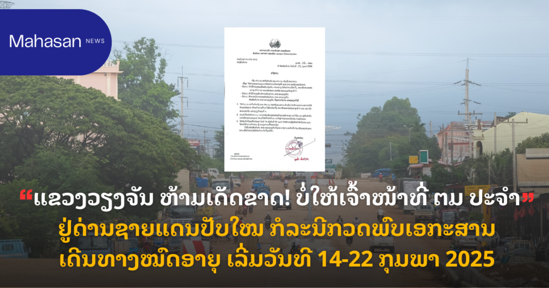 ແຂວງວຽງຈັນ ຫ້າມເດັດຂາດ! ບໍ່ໃຫ້ເຈົ້າໜ້າທີ່ ຕມ ປະຈຳຢູ່ດ່ານຊາຍແດນປັບໃໝ ກໍລະນີກວດພົບເອກະສານເດີນທາງໝົດອາຍຸ ເລີ່ມວັນທີ 14-22 ກຸມພາ 2026