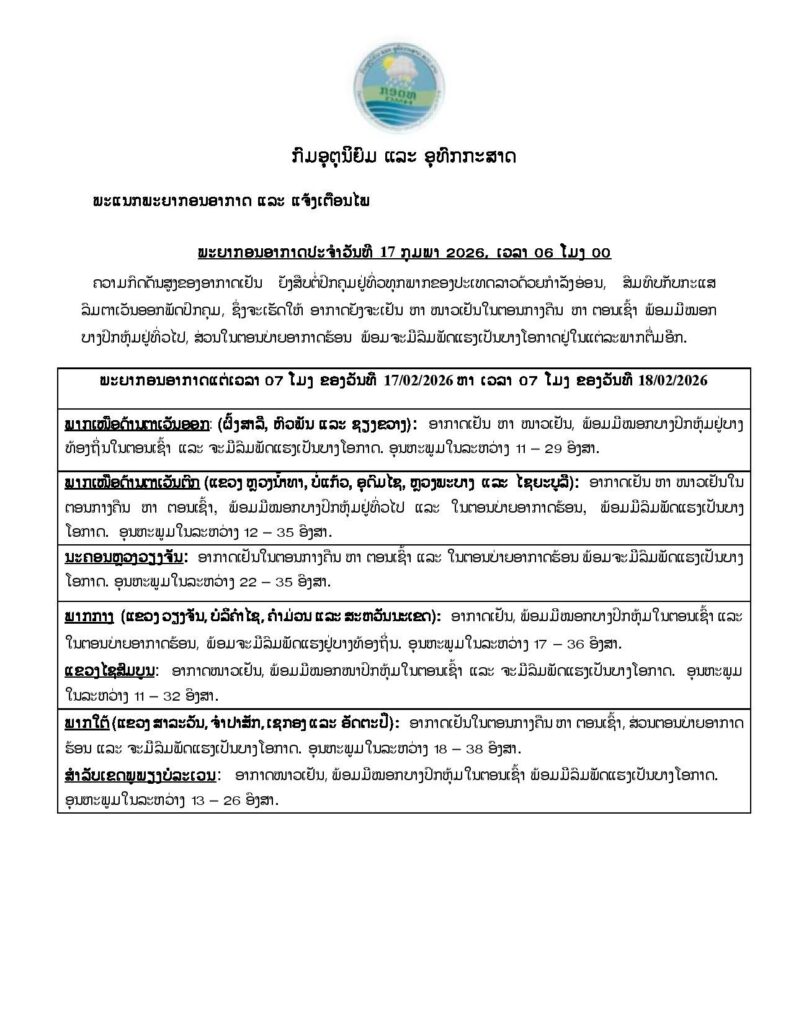 ລາຍງານສະພາບອາກາດປະຈໍາວັນທີ 17 ກຸມພາ 2026