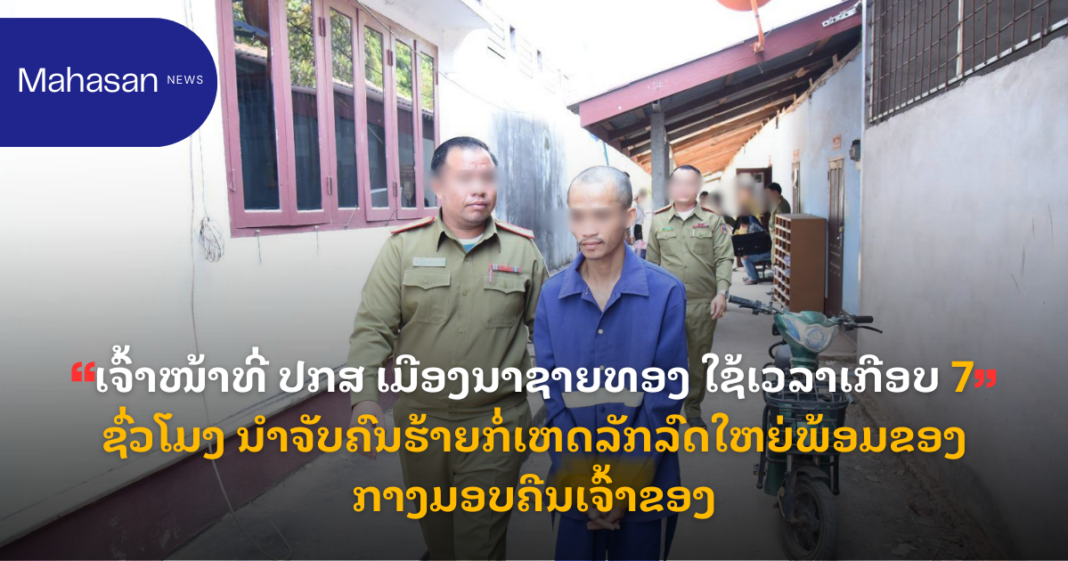 ເຈົ້າໜ້າທີ່ກຳລັງວິຊາສະເພາະ ກອງບັນຊາການ ປກສ ເມືອງນາຊາຍທອງ ສົມທົມກັບກຳລັງວິຊາສະເພາະພາກ ສ່ວນກ່ຽວຂ້ອງ ສາມາດນຳຈັບທ້າວ ດາວວຽງ ຫຼື ໂຕ່ ອາຍຸ 28 ປີ ໄດ້ຄາຫ້ອງແຖວທີ່ຜູ້ກ່ຽວເຊົ່າຢູ່ບ້ານດົງນາໂຊກໃຕ້ ເມືອງສີໂຄດຕະບອງ ພ້ອມຂອງກາງທີ່ລັກໄປ ຄືລົດກະບະຍີ່ຫໍ້ FORD RANGER ສີຂາວ ທະບຽນ ຫຄ 3366 ກຳ ແພງນະຄອນ ໃນວັນທີ 9 ກຸມພາ 2026 ເວລາປະມານ 22 ໂມງ ເຊິ່ງເຈົ້າໜ້າທີ່ ໃຊ້ເວລາເກືອບ 7 ຊົ່ວໂມງໃນການນຳຊອກຈັບ ພ້ອມທັງໄດ້ມອບລົດຄັນດັ່ງກ່າວຄືນໃຫ້ເຈົ້າຂອງເດີມໃນວັນທີ 17 ກຸມພາ 2026.