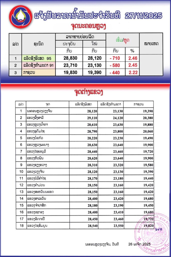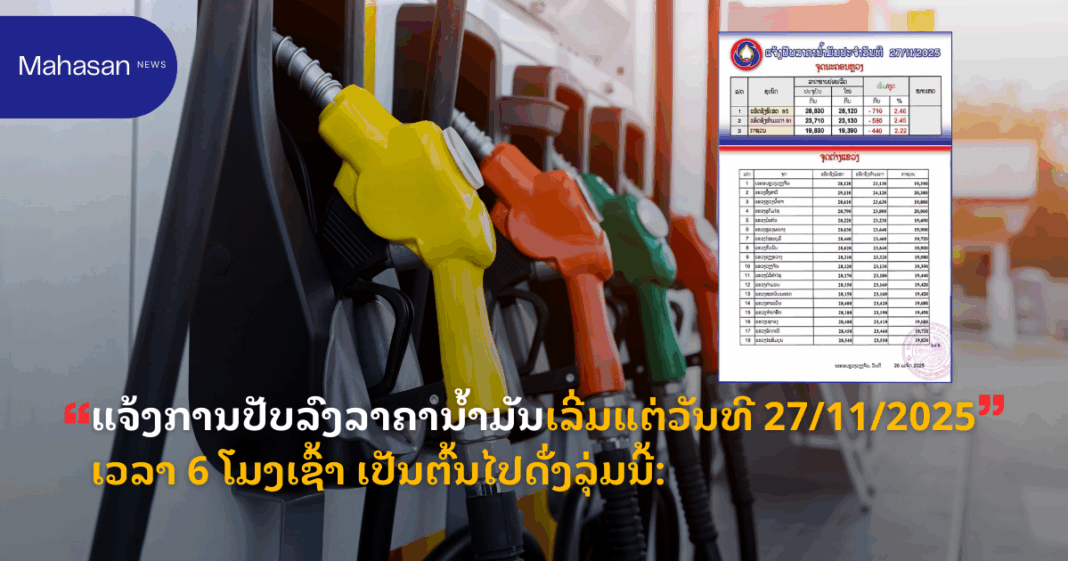 ແຈ້ງການ ປັບລົງລາຄານ້ຳມັນເລີ່ມແຕ່ວັນທີ 27/11/2025 ເວລາ 6 ໂມງເຊົ້າ ເປັນຕົ້ນໄປ.
