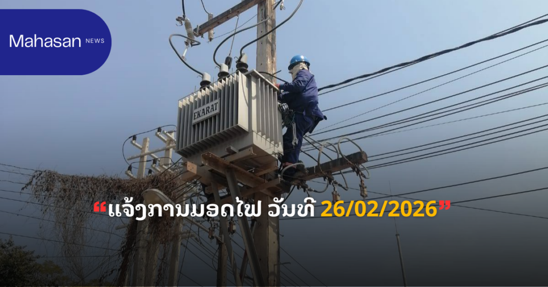 ແຈ້ງການ ແຈ້ງການມອດໄຟ ວັນທີ 26/02/2026 By Pele ທີ 24 February, 2026 0 219 Share FacebookTwitterPinterestWhatsApp Must read ແມັກຊິໂກເດືອດ! ແກັ້ງຄ້າຢາຕິດອາວຸດບຸກຈູດເຜົາເມືອງ ຫລັງຈາກກອງທັບ ສັງຫານ “ເອລ ເມັນໂຊ” ເຈົ້າພໍ່ຄ້າຍາ ເບີ1 ຂອງແມັກຊິໂກ ທີ 24 February, 2026 ແຈ້ງການປ່ຽນທິດທາງການສັນຈອນ ເພື່ອອຳນວຍຄວາມສະດວກ ໃນການແລ່ນລົດເມ (BRT) ທີ 24 February, 2026 ລາຍງານສະພາບອາກາດປະຈໍາວັນທີ 24 ກຸມພາ 2026 ທີ 24 February, 2026 ພິທີມອບ-ຮັບ ສິ່ງເສດເຫຼືອຂອງທະຫານອາເມຣິກາທີ່ຫາຍສາບສູນໃນປາງສົງຄາມຢູ່ລາວ ທີ 23 February, 2026 Pele ທີ່ມາ:EDL LAOS ລັດວິສາຫະກິດໄຟຟ້າລາວ ສາຂານະຄອນຫຼວງ1 Share FacebookTwitterPinterestWhatsApp Previous articleແຈ້ງການປ່ຽນທິດທາງການສັນຈອນ ເພື່ອອຳນວຍຄວາມສະດວກ ໃນການແລ່ນລົດເມ (BRT)Next articleແມັກຊິໂກເດືອດ! ແກັ້ງຄ້າຢາຕິດອາວຸດບຸກຈູດເຜົາເມືອງ ຫລັງຈາກກອງທັບ ສັງຫານ “ເອລ ເມັນໂຊ” ເຈົ້າພໍ່ຄ້າຍາ ເບີ1 ຂອງແມັກຊິໂກ More articles ແຈ້ງການປ່ຽນທິດທາງການສັນຈອນ ເພື່ອອຳນວຍຄວາມສະດວກ ໃນການແລ່ນລົດເມ (BRT) ທີ 24 February, 2026 ແຈ້ງລະດັບຝຸຸ່ນລະອອງ ທີ່ມີຂະໜາດນ້ອຍກວ່າ 2.5 ໄມຄຣອນ (PM 2.5) ທີ 23 February, 2026 ແຈ້ງການມອດໄຟ ວັນທີ 26/2/2026 ເມືອງ ສີສັດຕະນາກ ທີ 23 February, 2026 LEAVE A REPLY Cancel reply Comment: Please enter your comment! Name:* Please enter your name here Email:* You have entered an incorrect email address! Please enter your email address here Website: Save my name, email, and website in this browser for the next time I comment. - Advertisement - Latest article ແມັກຊິໂກເດືອດ! ແກັ້ງຄ້າຢາຕິດອາວຸດບຸກຈູດເຜົາເມືອງ ຫລັງຈາກກອງທັບ ສັງຫານ “ເອລ ເມັນໂຊ” ເຈົ້າພໍ່ຄ້າຍາ ເບີ1 ຂອງແມັກຊິໂກ ທີ 24 February, 2026 ແຈ້ງການປ່ຽນທິດທາງການສັນຈອນ ເພື່ອອຳນວຍຄວາມສະດວກ ໃນການແລ່ນລົດເມ (BRT) ທີ 24 February, 2026 ລາຍງານສະພາບອາກາດປະຈໍາວັນທີ 24 ກຸມພາ 2026 ທີ 24 February, 2026 ພິທີມອບ-ຮັບ ສິ່ງເສດເຫຼືອຂອງທະຫານອາເມຣິກາທີ່ຫາຍສາບສູນໃນປາງສົງຄາມຢູ່ລາວ ທີ 23 February, 2026 ປະທານາທິບໍດີ ໂດໂນ ທຣໍາ ຍົກລະດັບອັດຕາພາສີທົ່ວໂລກຂຶ້ນ 15% ໂດຍມີຜົນບັງຄັບໃຊ້ນັບແຕ່ວັນ 24 ກຸມພາ ເປັນຕົ້ນໄປ ທີ 23 February, 2026