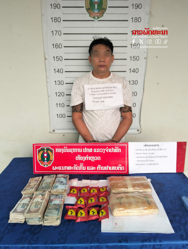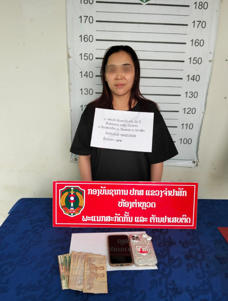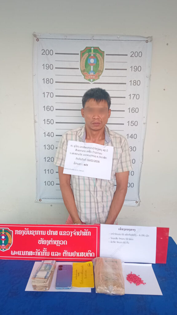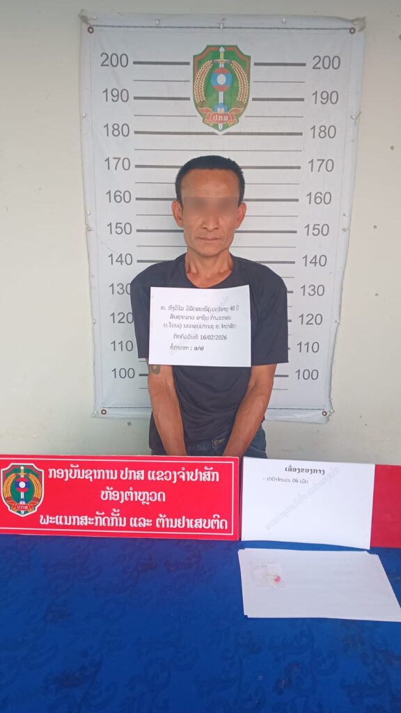 ປກສ ແຂວງຈຳປາສັກ ລາຍງານວ່າ: ວັນທີ 16 ກຸມພາ 2026 ເວລາປະມານ 11: 20 ນາທີ ເຈົ້າໜ້າທີ່ພະແນກຕຳຫລວດສະກັດກັ້ນ ແລະ ຕ້ານຢາເສບຕິດ ປກສ ແຂວງຈຳປາສັກ ສົມທົບກັບພາກສ່ວນກ່ຽວຂ້ອງ ອຳນາດການປົກຄອງບ້ານ ລົງມ້າງຄະດີຢາເສບຕິດ ຢູ່ເຂດບ້ານສະໜາມໄຊ ນະຄອນປາກເຊ ແຂວງຈຳປາສັກ ກັກຕົວຜູ້ຖືກຫາໄດ້ 6 ຄົນຄື: