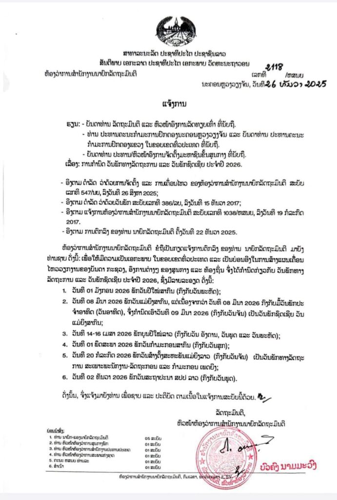 ອີງຕາມໜັງສືແຈ້ງການ ສະບັບເລກທີ 2118/ຫສນຍ, ລົງວັນທີ 26 ທັນວາ 2025 ຂອງຫ້ອງວ່າການສໍານັກງານນາຍົກລັດຖະມົນຕີ ໄດ້ລະບຸໄວ້ວ່າ: ຫ້ອງວ່າການສໍານັກງານນາຍົກລັດຖະມົນຕີ ຂໍຖືເປັນກຽດແຈ້ງການຕົກລົງ ຂອງທ່ານ ນາຍົກລັດຖະມົນຕີ ມາຍັງ ທ່ານຊາບ ດັ່ງນີ້: ເພື່ອໃຫ້ມີຄວາມເປັນເອກະພາບ ໃນຂອບເຂດທົ່ວປະເທດ ແລະ ເປັນບ່ອນອີງໃນການສ້າງແຜນເຄື່ອນໄຫວວຽກງານຂອງບັນດາ ກະຊວງ, ອົງການຕ່າງໆ ຂອງສູນກາງ ແລະ ທ້ອງຖິ່ນ ຈຶ່ງໄດ້ກຳນົດກ່ຽວກັບ ວັນພັກທາງລັດຖະການ ແລະ ວັນພັກຊົດເຊີຍ ປະຈຳປີ 2026: