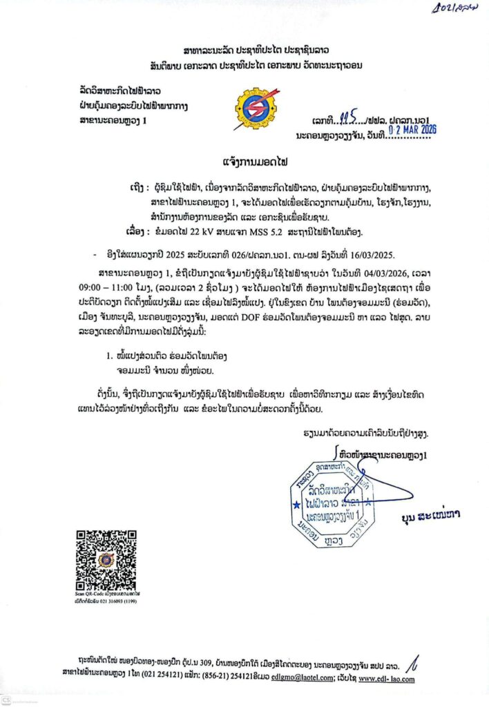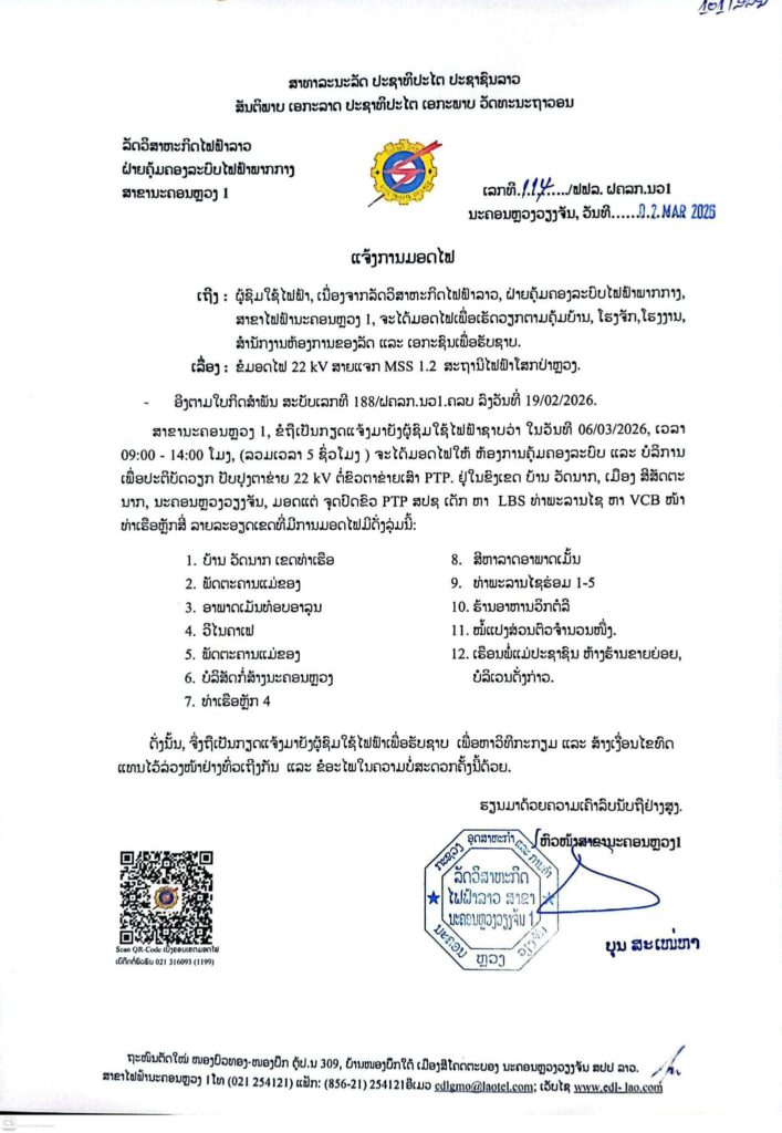 ແຈ້ງການ ແຈ້ງການມອດໄຟ ວັນທີ 4 ແລະ 6/3/2026 ເມືອງ ສີສັດຕະນາກ, ເມືອງ ຈັນທະບູລີ By Pele ທີ 3 March, 2026 0 146 Share FacebookTwitterPinterestWhatsApp Must read ເກີດເຫດລົດຕູ້ເສຍຫລັກປີ້ນ ບາດເຈັບ 1 ຄົນ ຢູ່ບ້ານນາຄວາຍກາງ ເມືອງຫາດຊາຍຟອງ ທີ 4 March, 2026 ກອງປະຊຸມຄົບຄະນະ ຄັ້ງທີ 2 ຂອງຄະນະບໍລິຫານງານສູນກາງພັກ ສະໄໝທີ XII ທີ 4 March, 2026 ຮອງລັດຖະມົນຕີ ຕິດຕາມ-ກວດກາ ປໍ້ານໍ້າມັນຖ້າພົບເຫັນເຈດຕະນາປິດເພື່ອເກັງກໍາໄລ ຈະຖອນໃບອະນຸຍາດ ທີ 4 March, 2026 ເກີດເຫດຄົນໂດດຂົວ ຂ້າມນໍ້າຂອງ ນະຄອນປາກເຊ ໃນຕອນເຊົ້າຂອງວັນທີ 4 ມີນາ 2026 ທີ 4 March, 2026 Pele ທີ່ມາ:EDL LAOS ລັດວິສາຫະກິດໄຟຟ້າລາວ ສາຂານະຄອນຫຼວງ1 Share FacebookTwitterPinterestWhatsApp Previous articleລາຍງານສະພາບອາກາດປະຈໍາວັນທີ 3 ມີນາ 2026Next articleຢຸດໃຫ້ບໍລິການຖ້ຽວບິນຊົ່ວຄາວ ຖ້ຽວບິນຂອງສາຍການບິນ ລາວສະກາຍເວ (LAO SKYWAY) ເສັ້ນບິນ ວຽງຈັນ-ຜົ້ງສາລີ-ວຽງຈັນ ຖ້ຽວບິນ LK202-203 ແລະ ວຽງຈັນ-ໄຊຍະບູລີ-ວຽງຈັນ ຖ້ຽວບິນ LK204-205 ຈົນກວ່າຈະມີແຈ້ງການ ສະບັບໃໝ່. More articles ອັດຕະປື ຫ້າມບໍ່ໃຫ້ຫລິ້ນວ່າວ, ປ່ອຍໂຄມໄຟ ແລະ ວັດຖຸອື່ນໆ ຢູ່ໃກ້ສາຍຕາຂ່າຍໄຟຟ້າ ທີ 4 March, 2026 ແຈ້ງການເສຍຄ່າທຳນຽມທາງປະຈຳປີ 2026 ທີ 4 March, 2026 ແຈ້ງປັບຂຶ້ນລາຄານ້ຳມັນ ເລິ່ມປະຕິບັດ 06:00 ໂມງຂອງວັນທີ 04/03/2026 ທີ 4 March, 2026 LEAVE A REPLY Cancel reply Comment: Please enter your comment! Name:* Please enter your name here Email:* You have entered an incorrect email address! Please enter your email address here Website: Save my name, email, and website in this browser for the next time I comment. - Advertisement - Latest article ເກີດເຫດລົດຕູ້ເສຍຫລັກປີ້ນ ບາດເຈັບ 1 ຄົນ ຢູ່ບ້ານນາຄວາຍກາງ ເມືອງຫາດຊາຍຟອງ ທີ 4 March, 2026 ກອງປະຊຸມຄົບຄະນະ ຄັ້ງທີ 2 ຂອງຄະນະບໍລິຫານງານສູນກາງພັກ ສະໄໝທີ XII ທີ 4 March, 2026 ຮອງລັດຖະມົນຕີ ຕິດຕາມ-ກວດກາ ປໍ້ານໍ້າມັນຖ້າພົບເຫັນເຈດຕະນາປິດເພື່ອເກັງກໍາໄລ ຈະຖອນໃບອະນຸຍາດ ທີ 4 March, 2026 ເກີດເຫດຄົນໂດດຂົວ ຂ້າມນໍ້າຂອງ ນະຄອນປາກເຊ ໃນຕອນເຊົ້າຂອງວັນທີ 4 ມີນາ 2026 ທີ 4 March, 2026 ອັດຕະປື ຫ້າມບໍ່ໃຫ້ຫລິ້ນວ່າວ, ປ່ອຍໂຄມໄຟ ແລະ ວັດຖຸອື່ນໆ ຢູ່ໃກ້ສາຍຕາຂ່າຍໄຟຟ້າ ທີ 4 March, 2026