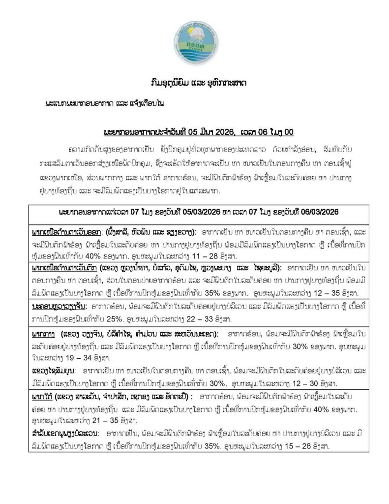 ລາຍງານສະພາບອາກາດປະຈໍາວັນທີ 5 ມີນາ 2026