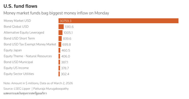 ຂໍ້ມູນຈາກ LSEG Lipper ສະແດງໃຫ້ເຫັນວ່າ ກອງທຶນຕະຫຼາດເງິນທົ່ວໂລກ (Money Market Funds) ມີເງິນໄຫຼເຂົ້າສູງເຖິງ 4.7 ໝື່ນລ້ານໂດລາ ຊຶ່ງເປັນລະດັບສູງສຸດນັບຕັ້ງແຕ່ວັນທີ 17 ກຸມພາ ເປັນຕົ້ນມາ. ເນື່ອງຈາກນັກລົງທຶນຕ່າງຊອກຫາແຫຼ່ງພັກເງິນໃນຕາສານໄລຍະສັ້ນທີ່ມີລັກສະນະຄ້າຍຄືກັບເງິນສົດ.