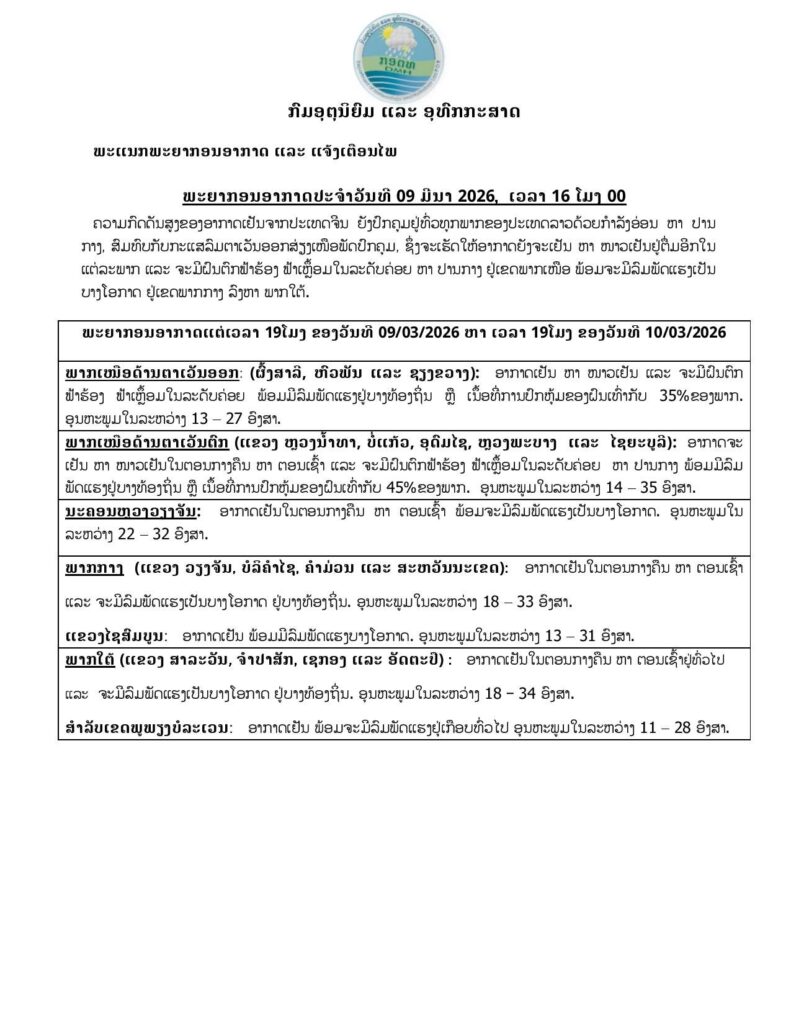 ຄວາມກົດດັນສູງຂອງອາກາດເຢັນຈາກປະເທດຈີນ ຍັງປົກຄຸມຢູູ່ທົົ່ວທຸກພາກຂອງປະເທດລາວ ດ້ວຍກໍາລັງອ່ອນ ຫາ ປານກາງ, ສົມທົບກັບກະແສລົມຕາເວັນອອກສ່ຽງເໜືອພັດປົກຄຸມ, ຊຶ່ງຈະເຮັດໃຫ້ອາກາດຍັງຈະເຢັນ ຫາ ໜາວເຢັນຢູູ່ຕື່ມອີກໃນແຕ່ລະພາກ ແລະ ຈະມີຝົນຕົກ ຟ້າຮ້ອງ ຟ້າເຫລື້ອມໃນລະດັບຄ່ອຍ ຫາ ປານກາງ ຢູູ່ເຂດພາກເໜືອ ພ້ອມຈະມີລົມພັດແຮງເປັນບາງໂອກາດ ຢູູ່ເຂດພາກກາງ ລົງຫາ ພາກໃຕ້.