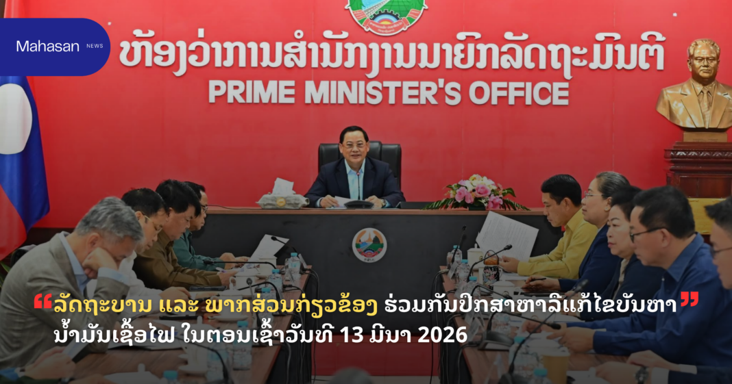 ໃນຕອນເຊົ້າວັນທີ 13 ມີນາ 2026 ທີ່ສໍານັກງານນາຍົກລັດຖະມົນຕີ ໄດ້ຈັດກອງປະຊຸມປຶກສາຫາລືແກ້ໄຂບັນຫານໍ້າມັນເຊື້ອໄຟ ຄັ້ງທີ 4 ພາຍຫຼັງທີ່ໄດ້ຮັບຜົນກະທົບຈາກສະພາບຄວາມບໍ່ສະຫງົບ ຢູ່ເຂດຕາເວັນອອກກາງ ເຮັດໃຫ້ລາຄານໍ້າມັນເຊື້ອໄຟເໜັງຕີງເພີ່ມຂຶ້ນແຮງ ແລະ ປະລິມານການນໍາເຂົ້ານໍ້າມັນ ມີທ່າອ່ຽງຫຼຸດລົງ, ພາຍໃຕ້ການເປັນປະ ທານ ຂອງທ່ານ ສອນໄຊ ສີພັນດອນ ນາຍົກລັດຖະມົນຕີ; ມີທ່ານ ຮອງນາຍົກລັດຖະມົນຕີ, ຜູ້ຊີ້ນໍາວຽກງານຂົງເຂດເສດຖະກິດ ແລະ ການພົວພັນການຮ່ວມມືກັບຕ່າງປະ ເທດ, ບັນດາທ່ານ ລັດຖະມົນຕີ-ຮອງລັດຖະມົນຕີ ກະ ຊວງ-ອົງການ, ຜູ້ຕາງໜ້າອົງການຈັດຕັ້ງພັກ, ອົງການຈັດ ຕັ້ງມະຫາຊົນ ແລະ ພາກທຸລະກິດທີ່ກ່ຽວຂ້ອງ ເຂົ້າຮ່ວມ.