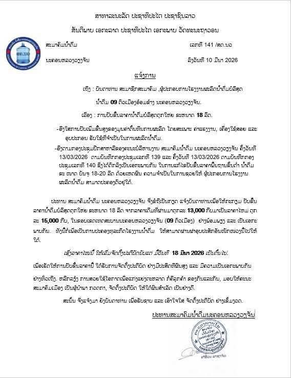 ວັນທີ 10 ມີນາ 2026 ສະມາຄົມນໍ້າດື່ມ ນະຄອນຫລວງວຽງຈັນ ອອກແຈ້ງການປັບຂຶ້ນລາຄານໍ້າດື່ມບໍລິສຸດຕຸກໃຫ່ຍ ຂະຫນາດ 18 ລິດ. ໂດຍອີງຕາມກອງປະຊຸມປຶກສາຫາລືຂອງຄະນະບໍລິຫານງານ ສະມາຄົມນໍ້າດື່ມ ນະຄອນຫລວງວຽງຈັນ ຄັ້ງວັນທີ 13/03/2026 ຕາມບັນທຶກກອງປະຊຸມເລກທີ 139 ແລະ ຄັ້ງວັນທີ 13/03/2026 ຕາມບັນທຶກກອງ ປະຊຸມເລກທີ 140 ຊຶ່ງໄດ້ຕົກລົງເປັນເອກະພາບກັນ ໃນການແກ້ໄຂປັບຂຶ້ນລາຄາພື້ນຖານຂັ້ນຕໍ່າ ນໍ້າດື່ມ ຂະໜາດ ບັນຈຸ 18-20 ລິດ ດ້ວຍເຫດຜົນ ຄວາມຈໍາເປັນໃນການຊ່ວຍໃຫ້ ຜູ້ປະກອບການໂຮງງານ ຜະລິດນໍ້າດື່ມ ສາມາດປະຄອງຕົວຢູ່ໄດ້.