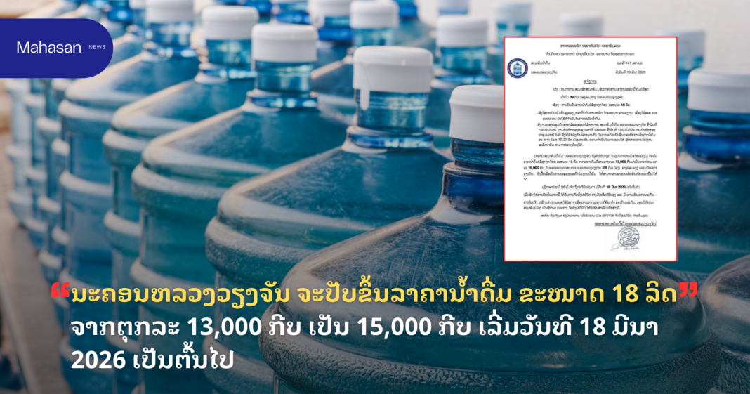 ນະຄອນຫລວງວຽງຈັນ ແຈ້ງປັບຂຶ້ນລາຄານໍ້າດື່ມ ຂະໜາດ 18 ລິດ ຈາກຕຸກລະ 13,000 ກີບ ເປັນ 15,000 ກີບ ເລີ່ມວັນທີ 18 ມີນາ 2026 ເປັນຕົ້ນໄປ
