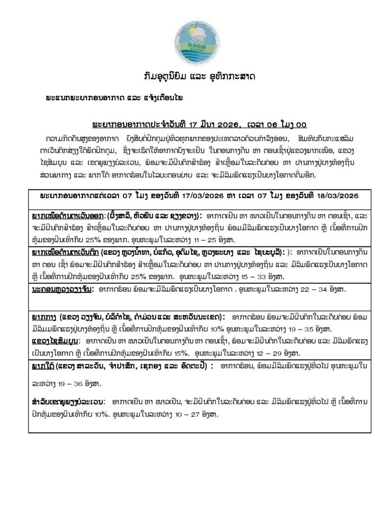 ຄວາມກົດດັນສູງຂອງອາກາດຍັງສືບຕໍ່ປົກຄຸມຢູ່ທົ່ວທຸກພາກຂອງປະເທດລາວ ດ້ວຍກໍາລັງອ່ອນ, ສົມທົບກັບກະແສລົມຕາເວັນຕົກສ່ຽງໃຕ້ພັດປົກຄຸມ, ເຊິ່ງຈະເຮັດໃຫ້ອາກາດຍັງຈະເຢັນໃນຕອນກາງຄືນ ຫາ ຕອນເຊົ້າຢູ່ແຂວງພາກເໜືອ, ແຂວງໄຊສົມບູນ ແລະ ເຂດພູພຽງບໍລະເວນ, ພ້ອມຈະມີຝົນຕົກ ຟ້າຮ້ອງ ຟ້າເຫລື້ອມໃນລະດັບຄ່ອຍ ຫາ ປານກາງຢູ່ບາງທ້ອງຖິ່ນ ສ່ວນພາກາງ ແລະ ພາກໃຕ້ ອາກາດຮ້ອນໃນໄລຍະຕອນບ່າຍ ແລະ ຈະມີລົມພັດແຮງເປັນບາງໂອກາດຕື່ມອີກ.