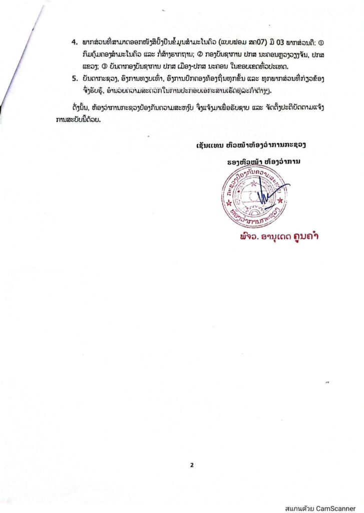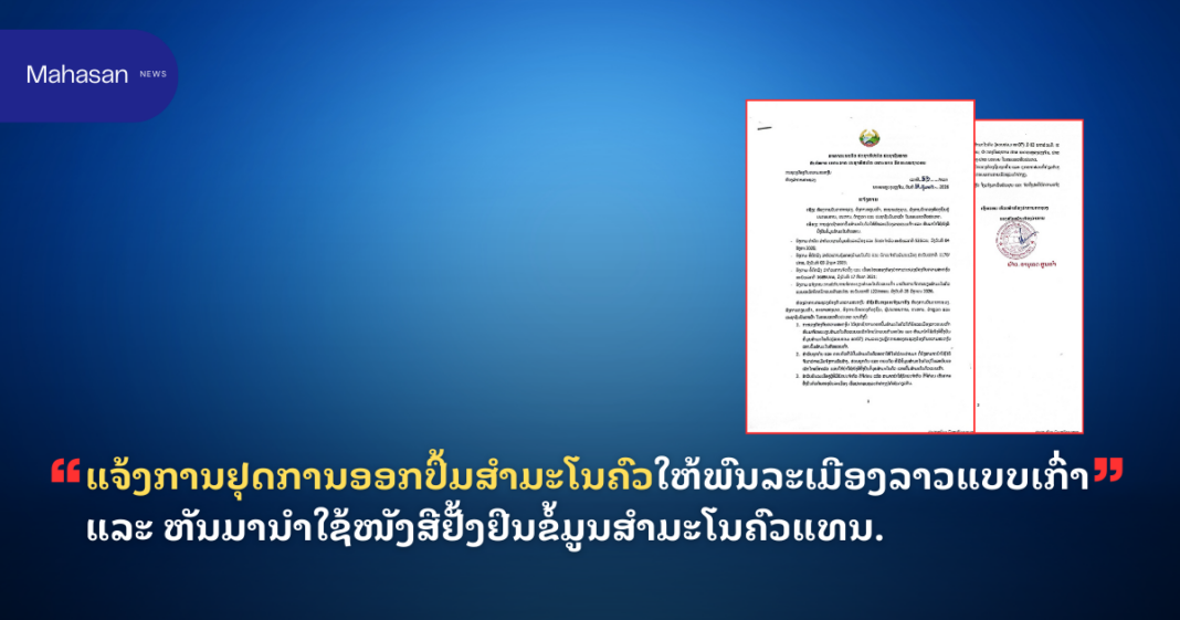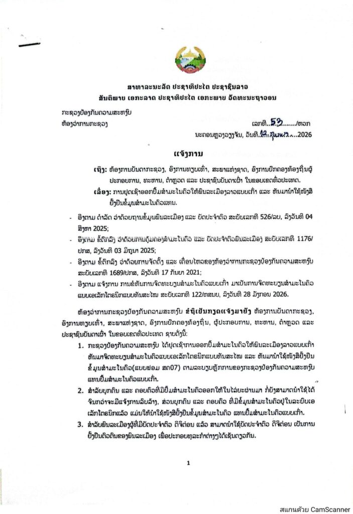 1. ກະຊວງປ້ອງກັນຄວາມສະຫງົບ ໄດ້ຢຸດເຊົາການອອກປື້ມສຳມະໂນຄົວໃຫ້ພົນລະເມືອງລາວແບບເກົ່າ ຫັນມາຈົດທະບຽນສໍາມະໂນຄົວແບບເອເລັກໂຕຣນິກແບບທັນສະໄໝ ແລະ ຫັນມານໍາໃຊ້ໜັງສືຢັ້ງຢືນ ຂໍ້ມູນສຳມະໂນຄົວ (ແບບຟອມ ສຄ07) ຕາມລະບຽບຫຼັກການຂອງກະຊວງປ້ອງກັນຄວາມສະຫງົບ ແທນປື້ມສຳມະໂນຄົວແບບເກົ່າ.