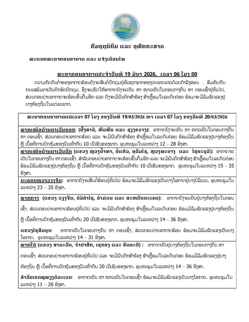 ລາຍງານສະພາບອາກາດປະຈໍາວັນທີ 19 ມີນາ 2026