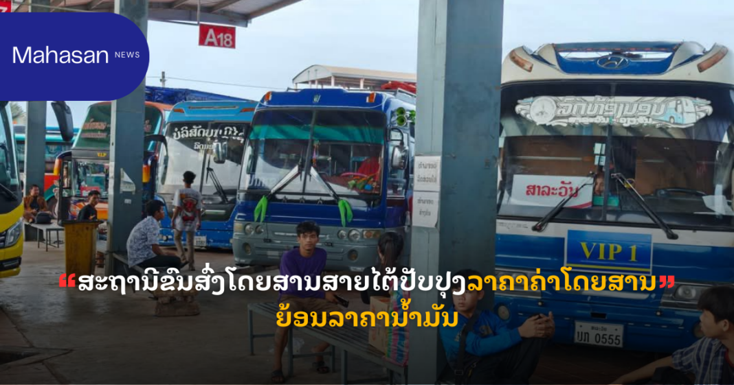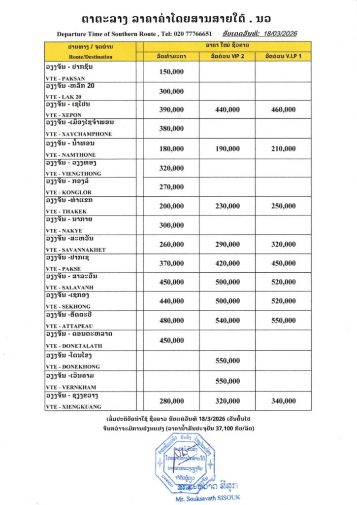ແຈ້ງການ ສະຖານີຂົນສົ່ງໂດຍສານສາຍໄຕ້ປັບປຸງລາຄາຄ່າໂດຍສານຍ້ອນລາຄານໍ້າມັນ By Pele ທີ 19 March, 2026 0 38 Share FacebookTwitterPinterestWhatsApp Must read ຈັບຕົວກຸ່ມແກ້ງໄວລຸ້ນ 29 ຄົນ ນັດອາລະວາດ ຕີກັນ ແລະ ມົ້ວສຸມດື່ມຄໍລາເຈັນ, ກະທ່ອມ ມາສຶກສາອົບຮົມ ທີ 19 March, 2026 ຈະລາຈອນ ນວ ເອົາໃຈໃສ່ ປະຕິບັດໜ້າທີ່ຈັດລະບຽບການໃສ່ນ້ຳມັນຂອງປະຊາຊົນ ທີ 19 March, 2026 ລາຄາວັດສະດຸກໍ່ສ້າງບາງຊະນິດແພງຂື້ນເກືອບ 50% ໃນນະຄອນຫຼວງວຽງຈັນ ທີ 19 March, 2026 ແຮງງານໄທເສຍຊີວິດ 1 ອີຣ່ານຍິງຂີປນາວຸດໃສ່ອິດສະຣາເອນກາງຄືນ ທີ 19 March, 2026 Pele ສະຖານີຂົນສົ່ງໂດຍສານສາຍໄຕ້ປັບປຸງລາຄາຄ່າໂດຍສານຍ້ອນລາຄານໍ້າມັນ, ເລີ່ມນຳໃຊ້ ວັນທີ 18 ມີນາ 2026 ເປັນຕົ້ນໄປຈົນກວ່າຈະມີການປ່ຽນແປງ. ທີ່ມາ:ໜັງສືພິມວຽງຈັນທາຍ Share FacebookTwitterPinterestWhatsApp Previous articleລາຍງານສະພາບອາກາດປະຈໍາວັນທີ 19 ມີນາ 2026Next articleອັບເດດ! ຂໍ້ມູນປ້ຳນ້ຳມັນທີ່ເປີດໃຫ້ບໍລິການຢູ່ ນະຄອນຫລວງວຽງຈັນປະຈຳວັນທີ 19 ມີນາ 2026 More articles ແຈ້ງການມອດໄຟ ວັນທີ 20,21,22,23/03/2026 ທີ 19 March, 2026 ລັດຖະບານຜ່ອນຜັນບາງມາດຕາຂອງກົດໝາຍທີ່ກ່ຽວຂ້ອງສຳລັບນ້ຳມັນເຊື້ອໄຟ ເພື່ອຫຼຸດຜ່ອນຜົນກະທົບຕໍ່ສັງຄົມ ທີ 19 March, 2026 ອັບເດດ! ຂໍ້ມູນປ້ຳນ້ຳມັນທີ່ເປີດໃຫ້ບໍລິການຢູ່ ນະຄອນຫລວງວຽງຈັນປະຈຳວັນທີ 19 ມີນາ 2026 ທີ 19 March, 2026 LEAVE A REPLY Cancel reply Comment: Please enter your comment! Name:* Please enter your name here Email:* You have entered an incorrect email address! Please enter your email address here Website: Save my name, email, and website in this browser for the next time I comment. - Advertisement - Latest article ຈັບຕົວກຸ່ມແກ້ງໄວລຸ້ນ 29 ຄົນ ນັດອາລະວາດ ຕີກັນ ແລະ ມົ້ວສຸມດື່ມຄໍລາເຈັນ, ກະທ່ອມ ມາສຶກສາອົບຮົມ ທີ 19 March, 2026 ຈະລາຈອນ ນວ ເອົາໃຈໃສ່ ປະຕິບັດໜ້າທີ່ຈັດລະບຽບການໃສ່ນ້ຳມັນຂອງປະຊາຊົນ ທີ 19 March, 2026 ລາຄາວັດສະດຸກໍ່ສ້າງບາງຊະນິດແພງຂື້ນເກືອບ 50% ໃນນະຄອນຫຼວງວຽງຈັນ ທີ 19 March, 2026 ແຮງງານໄທເສຍຊີວິດ 1 ອີຣ່ານຍິງຂີປນາວຸດໃສ່ອິດສະຣາເອນກາງຄືນ ທີ 19 March, 2026 ແຈ້ງການມອດໄຟ ວັນທີ 20,21,22,23/03/2026 ທີ 19 March, 2026