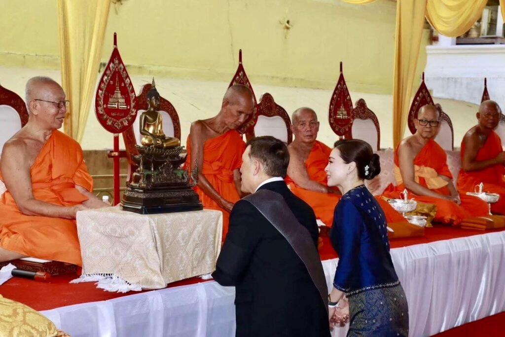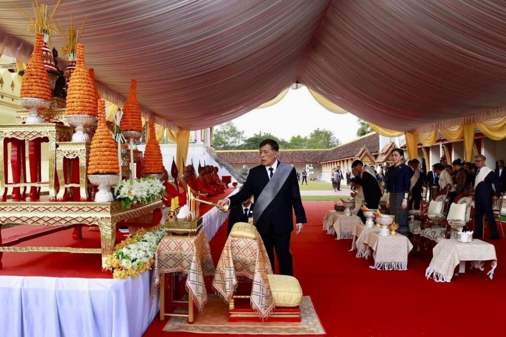 ໃນໂອກາດດັ່ງກ່າວ, ພະບາດສົມເດັດ ພຣະວະຊິຣະເກົ້າເຈົ້າຢູ່ຫົວ ແລະ ສົມເດັດພະນາງເຈົ້າ ພຣະບໍຣົມລາຊິນີ ແຫ່ງ ລາຊະອານາຈັກໄທ ແລະ ທ່ານ ທອງລຸນ ສີສຸລິດ ປະ ທານປະເທດ ແຫ່ງ ສປປ ລາວ ພ້ອມດ້ວຍພັນລະຍາ ໄດ້ຮ່ວມກັນຈູດທຽນບູຊາພຣະຣັດຕະນະໄຕຣ, ຖວາຍທານແກ່ພະສົງ 9 ອົງ, ຮັບຟັງພະສົງສູດ ແລະ ຢາດນໍ້າຮັບພອນ ເພື່ອເປັນສິລິມຸງຄຸນ.