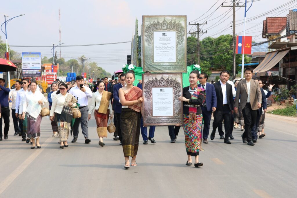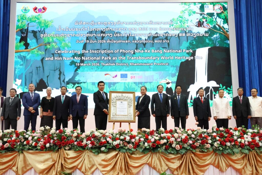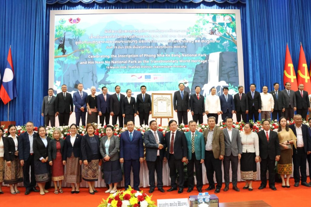 ແຂວງຄໍາມ່ວນ ຈັດພິທີສະເຫລີມສະຫລອງຢ່າງຍິ່ງໃຫຍ່ ເນື່ອງໃນໂອກາດທີ່ “ອຸທິຍານແຫ່ງຊາດ ຫີນໜາມໜໍ່” ໄດ້ຮັບຂຶ້ນທະບຽນເປັນມໍລະດົກໂລກທາງທຳມະຊາດ ຮ່ວມຊາຍແດນກັບ ອຸທິຍານແຫ່ງຊາດ ຟອງຫຍາ-ແກບາງ ຂອງ ສສ ຫວຽດນາມ ໃນວັນທີ 19 ມີນາ 2026 ຢູ່ເມືອງທ່າແຂກ ແຂວງຄໍາມ່ວນ ໃຫ້ກຽດເຂົ້າຮ່ວມໂດຍ ທ່ານ ສອນໄຊ ສີພັນດອນ ນາຍົກລັດຖະມົນຕີ, ທ່ານ ໄຊຊະນະ ໂຄດພູທອນ ກໍາມະການສູນກາງພັກ, ເລຂາພັກແຂວງ, ມີບັນດາການນໍາສູນກາງ, ການນໍາແຂວງ, ອະດີດການນໍາ, ບັນດາອົງການສາກົນ, ແຂວງກວາງຈິ ສສ ຫວຽດນາມ ແລະ ແຂກຖືກເຊີນທັງພາຍໃນ ແລະ ສາກົນ ເຂົ້າຮ່ວມ.