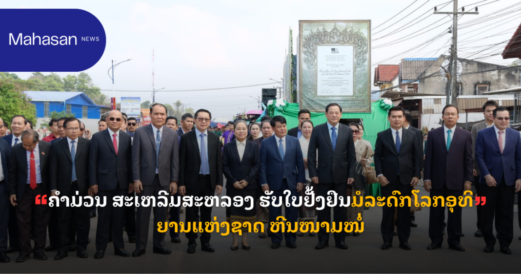 ແຂວງຄໍາມ່ວນ ຈັດພິທີສະເຫລີມສະຫລອງຢ່າງຍິ່ງໃຫຍ່ ເນື່ອງໃນໂອກາດທີ່ “ອຸທິຍານແຫ່ງຊາດ ຫີນໜາມໜໍ່” ໄດ້ຮັບຂຶ້ນທະບຽນເປັນມໍລະດົກໂລກທາງທຳມະຊາດ ຮ່ວມຊາຍແດນກັບ ອຸທິຍານແຫ່ງຊາດ ຟອງຫຍາ-ແກບາງ ຂອງ ສສ ຫວຽດນາມ ໃນວັນທີ 19 ມີນາ 2026 ຢູ່ເມືອງທ່າແຂກ ແຂວງຄໍາມ່ວນ ໃຫ້ກຽດເຂົ້າຮ່ວມໂດຍ ທ່ານ ສອນໄຊ ສີພັນດອນ ນາຍົກລັດຖະມົນຕີ, ທ່ານ ໄຊຊະນະ ໂຄດພູທອນ ກໍາມະການສູນກາງພັກ, ເລຂາພັກແຂວງ, ມີບັນດາການນໍາສູນກາງ, ການນໍາແຂວງ, ອະດີດການນໍາ, ບັນດາອົງການສາກົນ, ແຂວງກວາງຈິ ສສ ຫວຽດນາມ ແລະ ແຂກຖືກເຊີນທັງພາຍໃນ ແລະ ສາກົນ ເຂົ້າຮ່ວມ.
