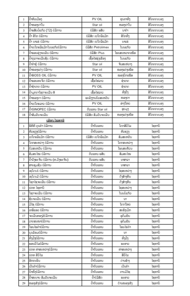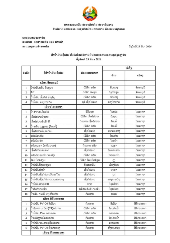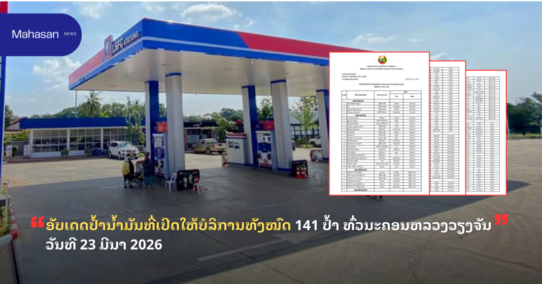 ແຈ້ງການ ອັບເດດປ້ຳນ້ຳມັນທີ່ເປີດໃຫ້ບໍລິການທັງໝົດ 141 ປໍ້າ ທົ່ວນະຄອນຫລວງວຽງຈັນ ວັນທີ 23 ມີນາ 2026 By Jenjila ທີ 23 March, 2026 0 530 Share FacebookTwitterPinterestWhatsApp Must read ເມື່ອພີ່ດື້ຊ້າງປ່າແຫ່ງອຸທິຍານແຫ່ງຊາດເຂົາໃຫຍ່ແຂກໂຕນ້ອຍຢາກກິນຕຳບັກຫຸ່ງ… ຄວາມວຸ່ນວາຍທີ່ໜ້າຮັກຈຶ່ງເກີດຂຶ້ນ! ທີ 3 April, 2026 M moneyX ຮ່ວມມືກັບ Visa ເພື່ອເປີດທົດລອງບັດ VISA Prepaid Card ແລະ ພັດທະນາ Visa Pay ເພື່ອການຊຳລະເງິນດິຈິຕອນໃນລາວ ເເລະ ສາກົນ ທີ 3 April, 2026 ຈີນ ຮຽກຮ້ອງທົ່ວໂລກຮ່ວມມື ປາບປາມການສໍ້ໂກງ ທາງຄົມມະນາຄົມ-ອາຊະຍາກຳໄຊເບີຣ ທີ 3 April, 2026 ແຈ້ງການມອດໄຟ ວັນທີ 04,05/04/2026 ທີ 3 April, 2026 Jenjila ອັບເດດປ້ຳນ້ຳມັນທີ່ເປີດໃຫ້ບໍລິການທັງໝົດ 141 ປໍ້າ ທົ່ວນະຄອນຫລວງວຽງຈັນ ວັນທີ 23 ມີນາ 2026 ດັ່ງລຸ່ມນີ້: Share FacebookTwitterPinterestWhatsApp Previous articleສະພາແຫ່ງຊາດເຫັນດີຮັບຮອງ ທ່ານ ສອນໄຊ ສີພັນດອນ ເປັນນາຍົກລັດຖະມົນຕີ ແຫ່ງ ສປປ ລາວ ດ້ວຍຄະແນນສຽງ 170 ຄະແນນ ເທົ່າກັບ 98.83%Next articleອັນຕະລາຍໃກ້ຕົວ! ຢ່າໃຊ້ຕຸກນ້ຳ ຫຼື ຖັງພລາສະຕິກທົ່ວໄປເຕີມນ້ຳມັນ ເສ່ຽງລະເບີດຈາກໄຟຟ້າສະຖິດ. More articles ແຈ້ງການມອດໄຟ ວັນທີ 04,05/04/2026 ທີ 3 April, 2026 ແຈ້ງການມອດໄຟ ວັນທີ 3/4/2026 ບ້ານ ໂພນຕ້ອງສະຫວາດ ເມືອງ ຈັນທະບູລີ ທີ 2 April, 2026 ແຈ້ງການ ກົມການຄ້າພາຍໃນ ກະຊວງ ອຸດສາຫະກຳ ແລະ ການຄ້າ ທີ 1 April, 2026 LEAVE A REPLY Cancel reply Comment: Please enter your comment! Name:* Please enter your name here Email:* You have entered an incorrect email address! Please enter your email address here Website: Save my name, email, and website in this browser for the next time I comment. - Advertisement - Latest article ເມື່ອພີ່ດື້ຊ້າງປ່າແຫ່ງອຸທິຍານແຫ່ງຊາດເຂົາໃຫຍ່ແຂກໂຕນ້ອຍຢາກກິນຕຳບັກຫຸ່ງ… ຄວາມວຸ່ນວາຍທີ່ໜ້າຮັກຈຶ່ງເກີດຂຶ້ນ! ທີ 3 April, 2026 M moneyX ຮ່ວມມືກັບ Visa ເພື່ອເປີດທົດລອງບັດ VISA Prepaid Card ແລະ ພັດທະນາ Visa Pay ເພື່ອການຊຳລະເງິນດິຈິຕອນໃນລາວ ເເລະ ສາກົນ ທີ 3 April, 2026 ຈີນ ຮຽກຮ້ອງທົ່ວໂລກຮ່ວມມື ປາບປາມການສໍ້ໂກງ ທາງຄົມມະນາຄົມ-ອາຊະຍາກຳໄຊເບີຣ ທີ 3 April, 2026 ແຈ້ງການມອດໄຟ ວັນທີ 04,05/04/2026 ທີ 3 April, 2026 ລາຍງານສະພາບອາກາດປະຈໍາວັນທີ 03 ເມສາ 2026 ທີ 3 April, 2026