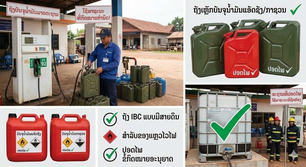 • ການເລືອກພາຊະນະ: ຄວນໃຊ້ຖັງເຫຼັກ ຫຼື ຖັງພລາສະຕິກຊະນິດພິເສດທີ່ລະບຸວ່າ “For Fuel Use Only” ເທົ່ານັ້ນ.