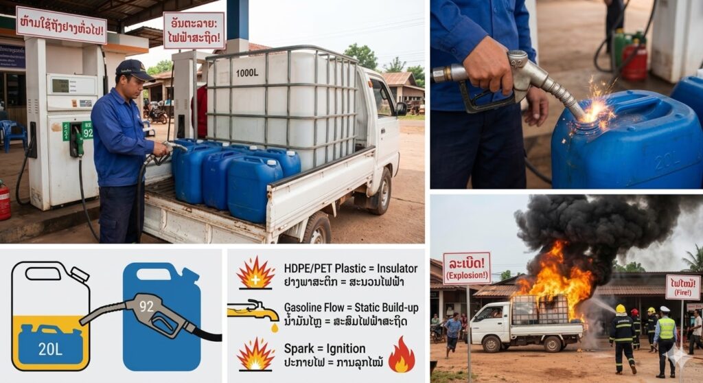 ອັນຕະລາຍໃກ້ຕົວ! ຢ່າໃຊ້ຕຸກນ້ຳ ຫຼື ຖັງພລາສະຕິກທົ່ວໄປເຕີມນ້ຳມັນ ເສ່ຽງລະເບີດຈາກໄຟຟ້າສະຖິດ.