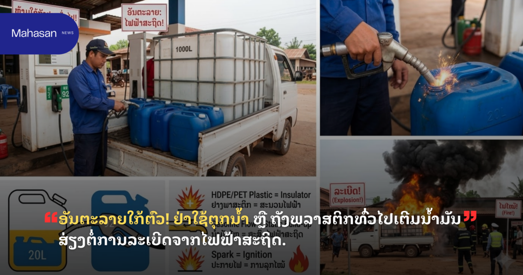 ອັນຕະລາຍໃກ້ຕົວ! ຢ່າໃຊ້ຕຸກນ້ຳ ຫຼື ຖັງພລາສະຕິກທົ່ວໄປເຕີມນ້ຳມັນ ເສ່ຽງລະເບີດຈາກໄຟຟ້າສະຖິດ.